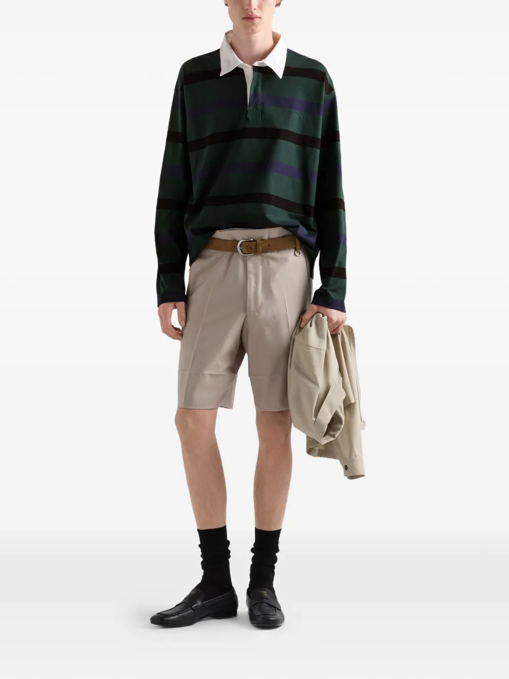 レトロな雰囲気とカジュアルなスタイルを体現する長袖コットンポロシャツ。ストライプがオーバーサイズスタイルを引きたて、意外性のあるディテールで仕上げられています。