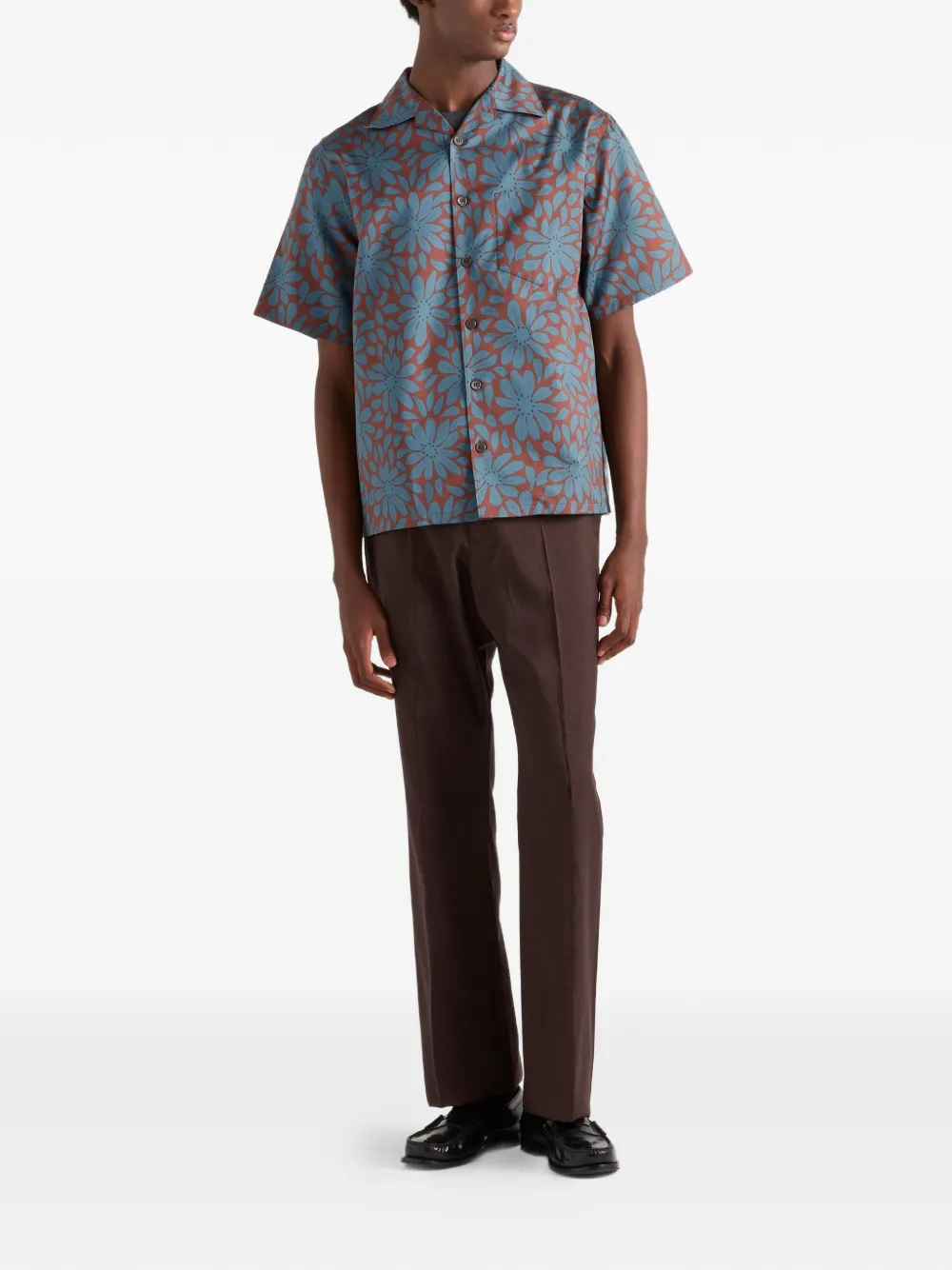 モダニストのフローラルプリントが端正なカッティングのシルエットに躍動感を添える、半袖ボウリングシャツ。トライアングルロゴが特徴的なアクセントを添えます。