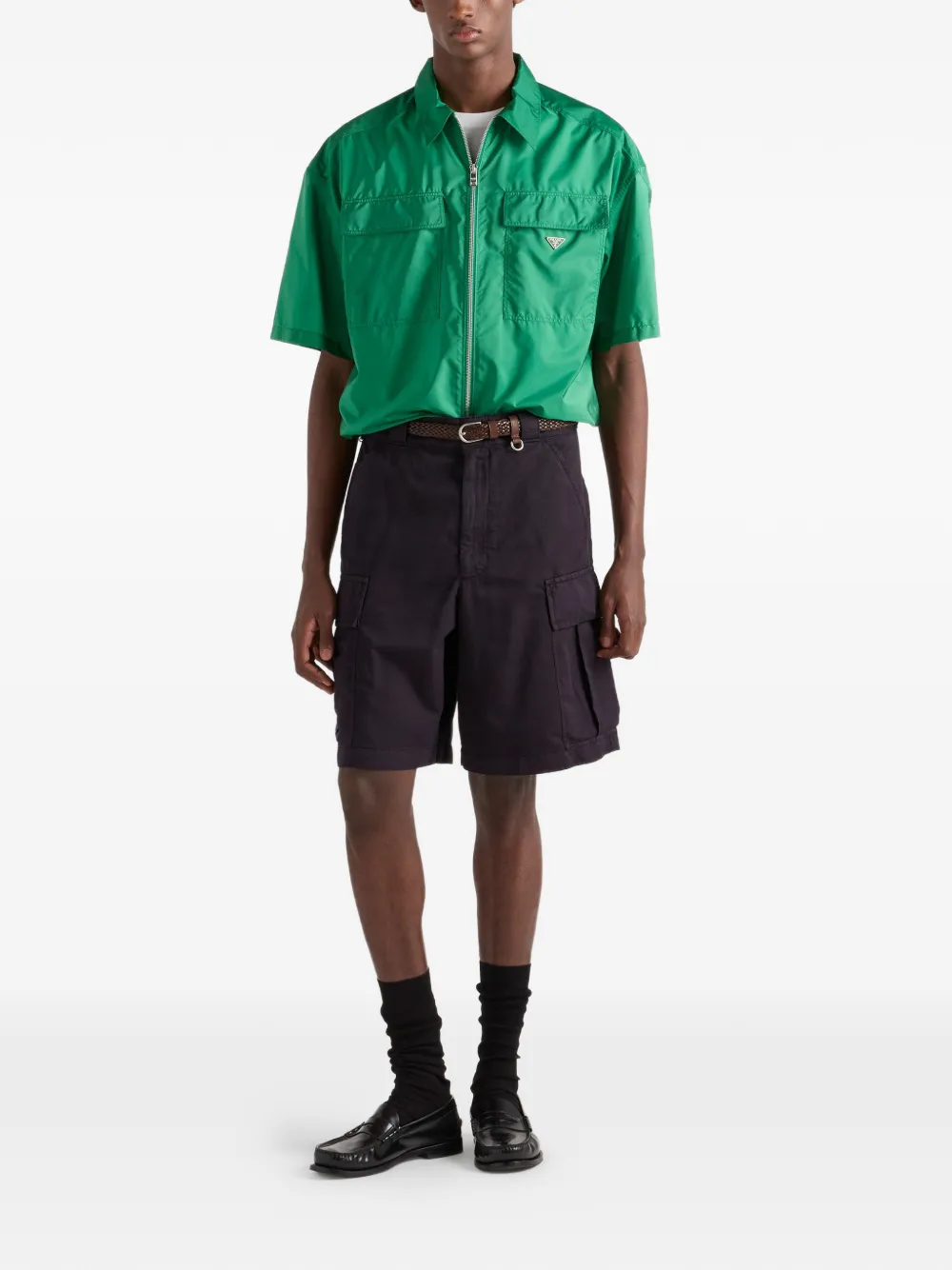 ユーティリティディテールとスポーティな要素がコンテンポラリーでミニマルなデザインの中で融合した半袖シャツ。Re-Nylonの軽やかなシルエットはボクシーなラインとフロントの大きなポケットが特徴で、ジップクロージャーが実用的でシンプルなアクセントを添えています。エナメルメタルトライアングルロゴが、アイコニックで特徴的なシグネチャーに。