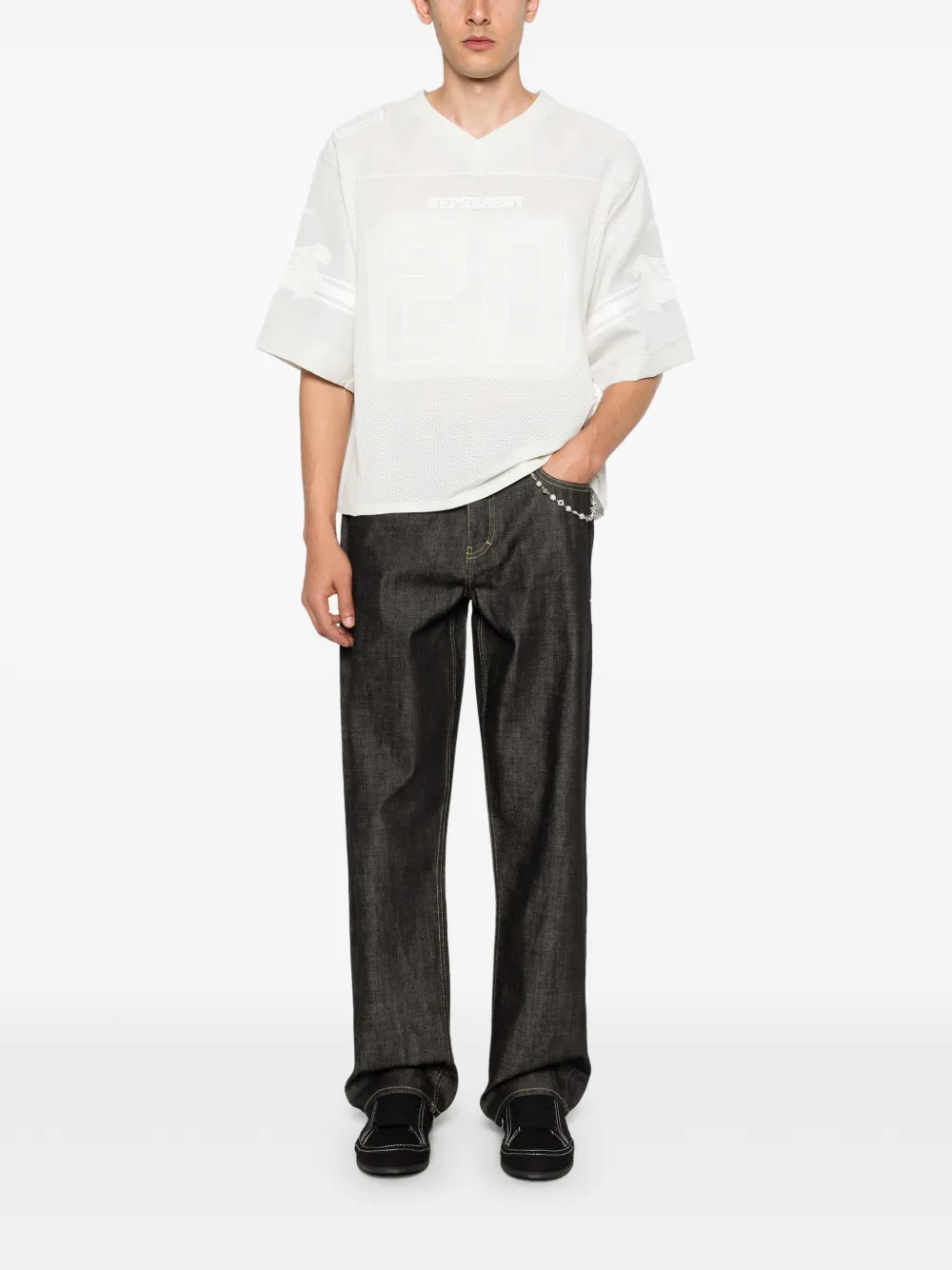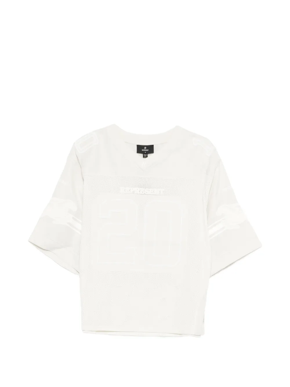 ivory V-neck short sleeve number detail perforated texture