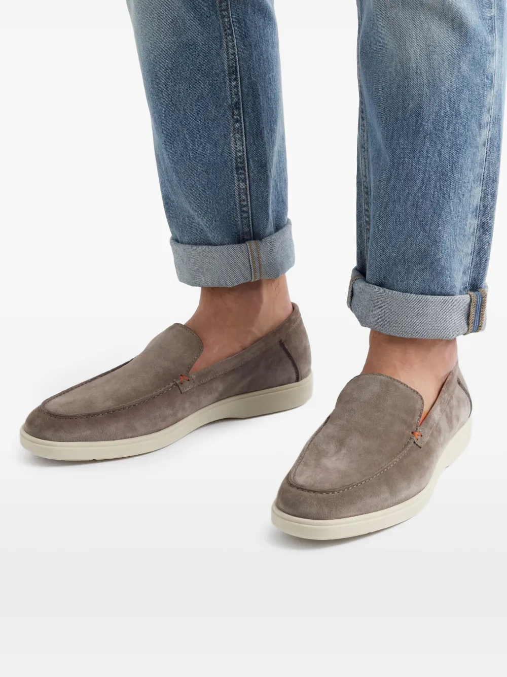グレー、カーフレザー、カーフスエード、同系色ステッチ、アーモンドトゥ、留め具なし、ブランドロゴ入りインソール、フラットラバーソール。