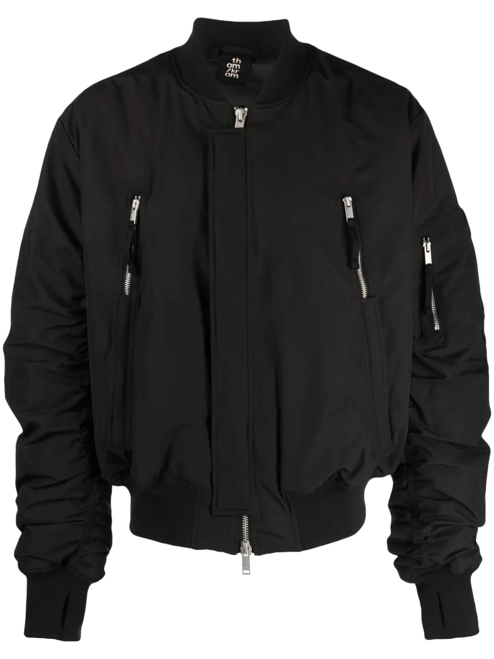 ブラック、シャーリングディテール、シルバートーンの金具、ベースボールカラー、コンシールジップ式開閉、ロングスリーブ、サイドにジップポケット x 2、ストレートな裾。