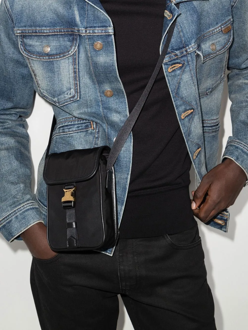 ブラック、レザー、ゴールドトーンの金具、ロゴバックル留め、メインコンパートメント、調節可能なネックストラップ。