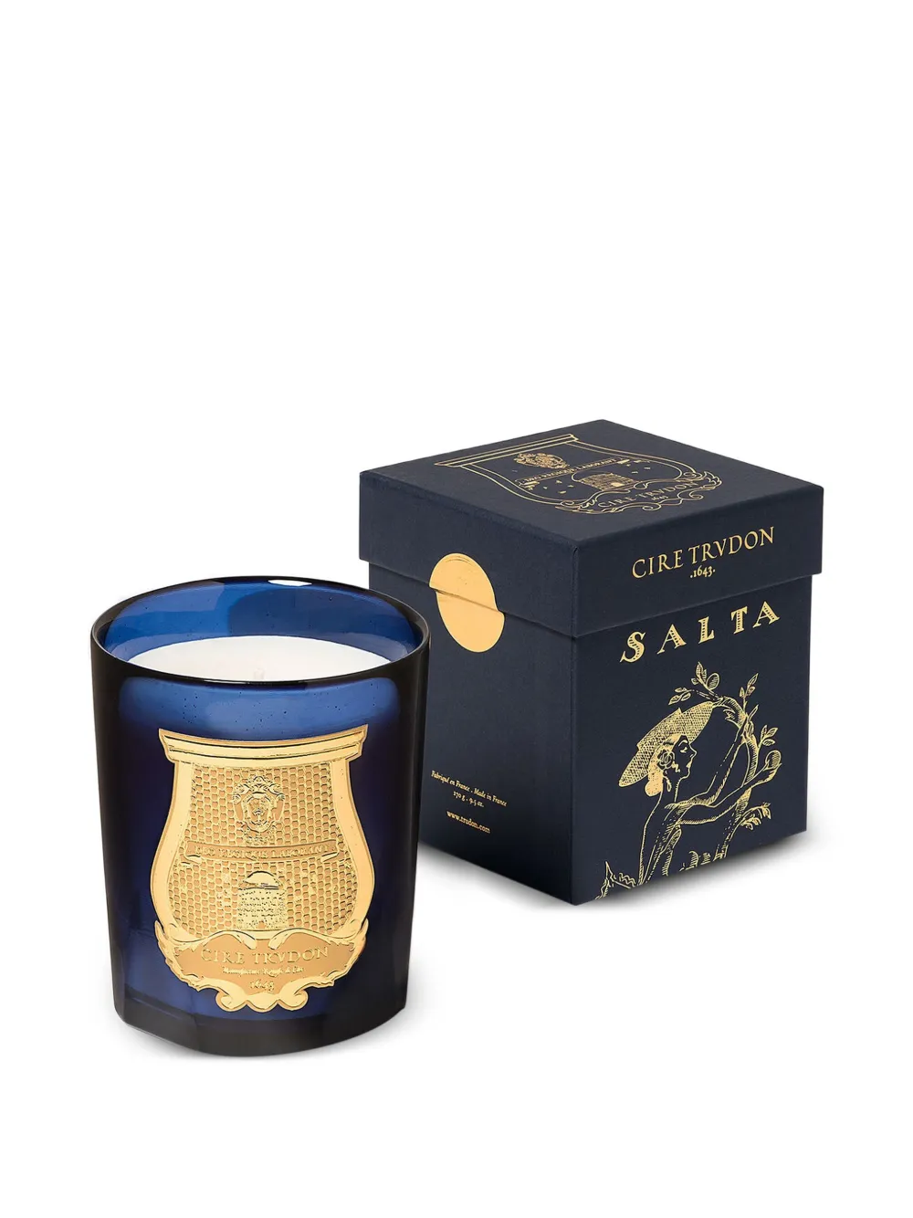 ゴールドトーンのロゴプレート、コットン芯、燃焼時間:約60時間。ブルー。