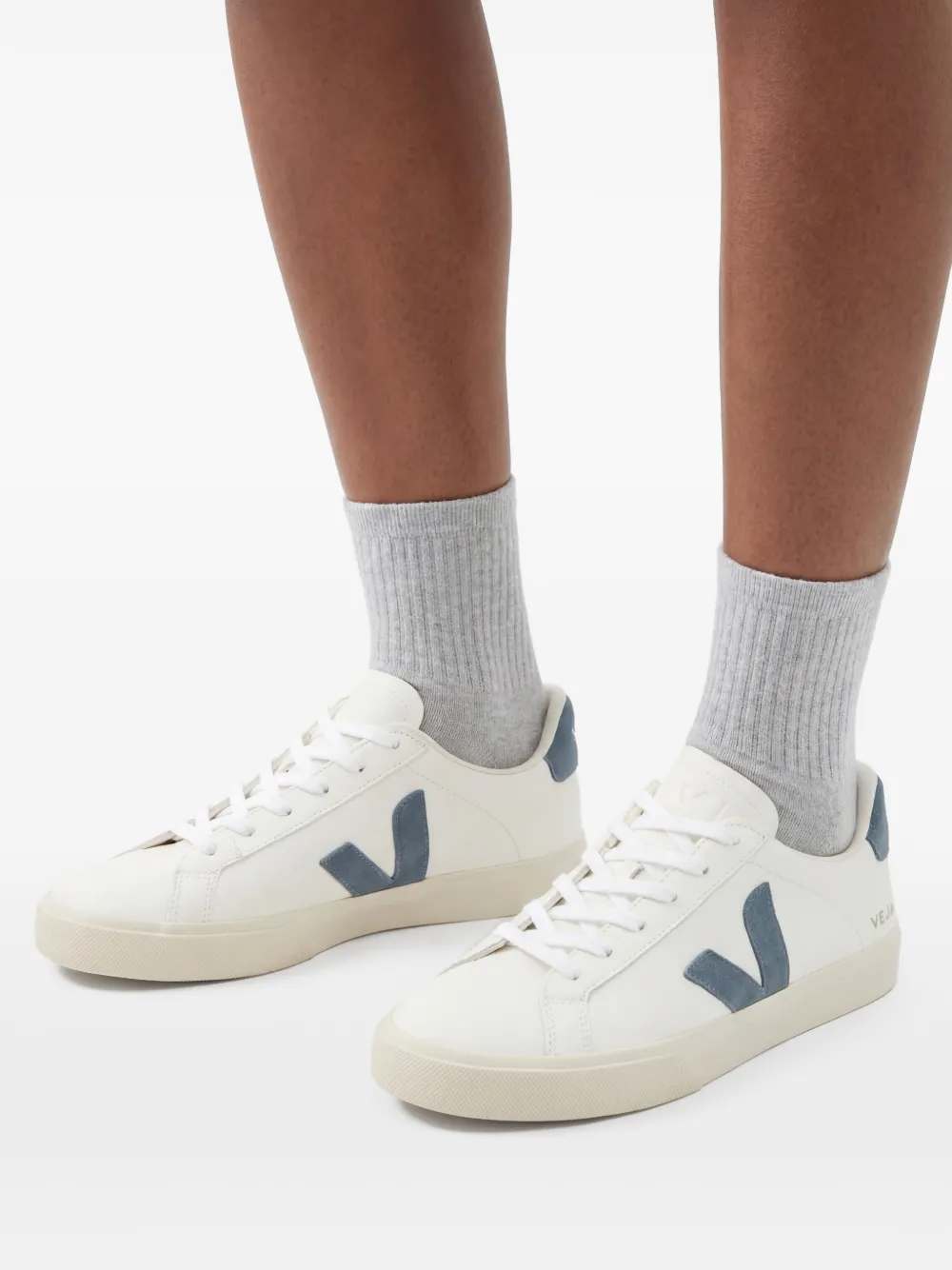 ホワイト、ブルーグレー、カーフレザー、フロントにレースアップ、ラウンドトゥ、サイドにロゴパッチ、ブランドロゴ入りヒールカウンター、フラットラバーソール。エシカルコンシャス: