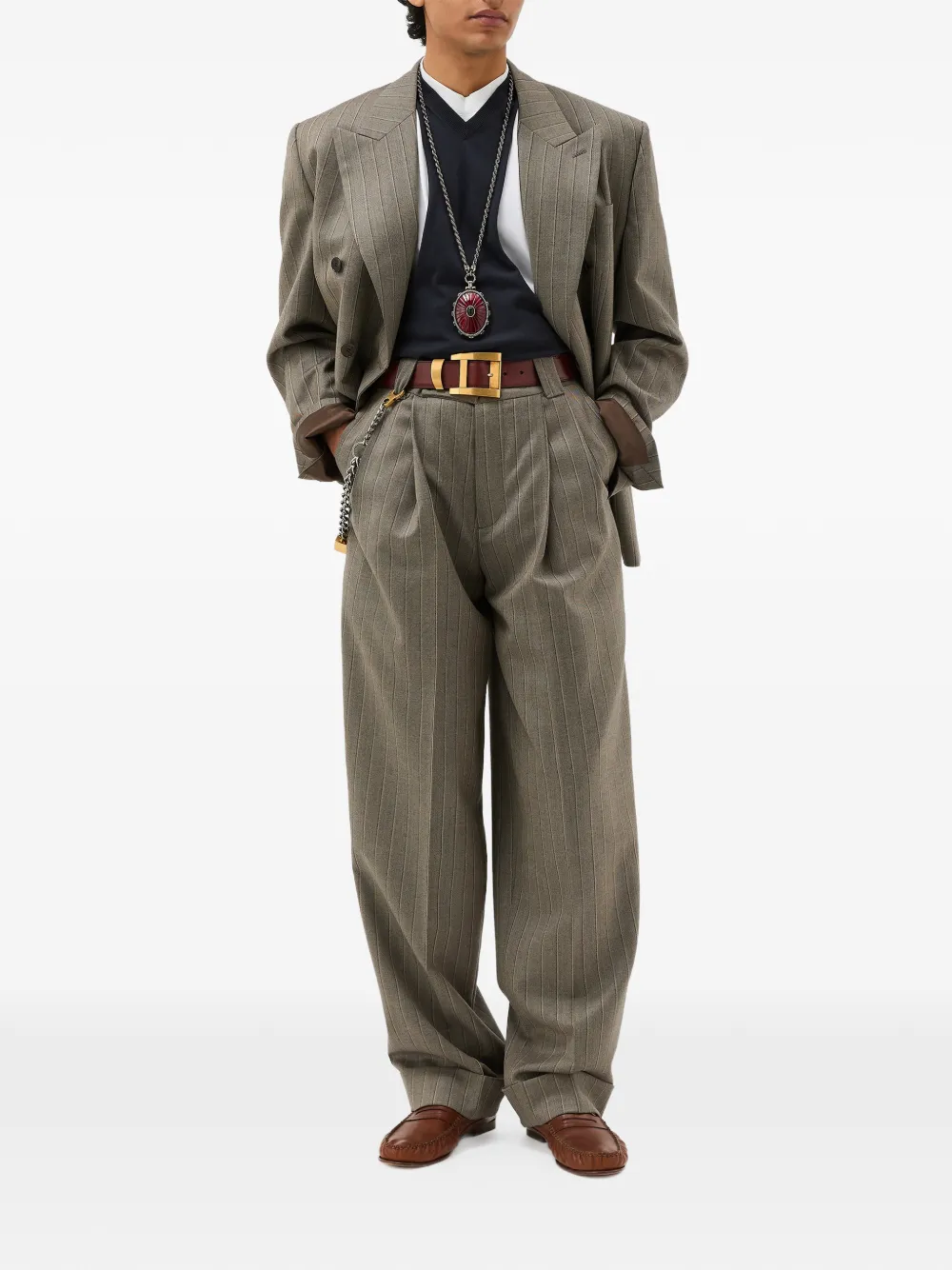 ピンストライプウールを使用したオーバーサイズのフォーマルパンツ。フロントタックが施され、ベルトループにはメドゥーサのハードウェアがあしらわれています。
