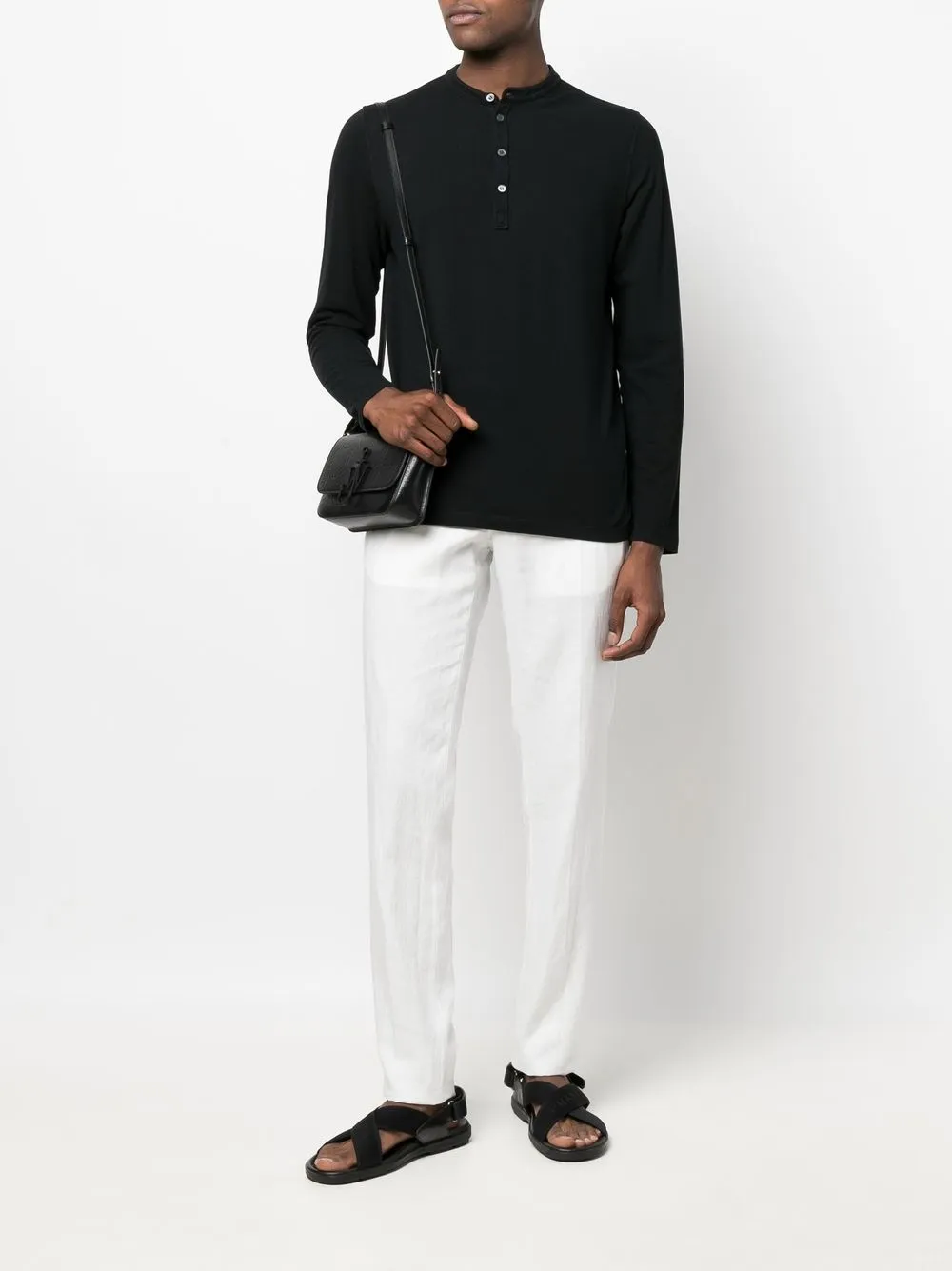 ブラック、コットン、ファインニット、クルーネック、プラケットフロント、ロングスリーブ。
