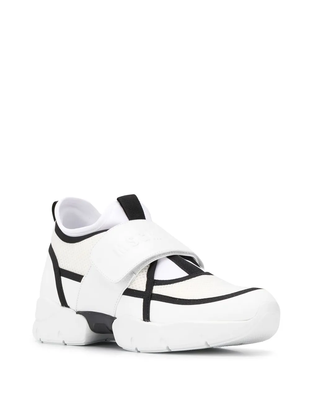 MSGM(エム・エス・ジー・エム)の、チャンキー スニーカー(ホワイト)。ノンスリップソール、ラウンドトゥ、レースアップフロント、ベルクロテープ留め、背面にタブ、ブランドロゴ入りのインソール、シューズのタンにロゴ。