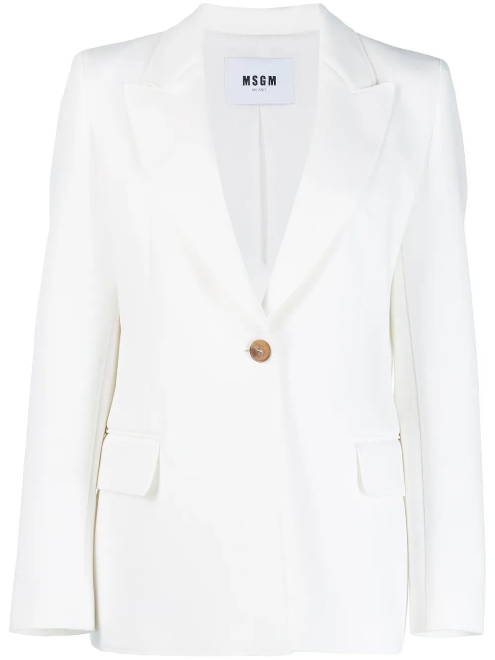 MSGM(エム・エス・ジー・エム)の、ピークドラペル ジャケット(ホワイト)。立体的なショルダー、ピークドラペル、フロントボタン留め、前面にフラップ付きポケット。