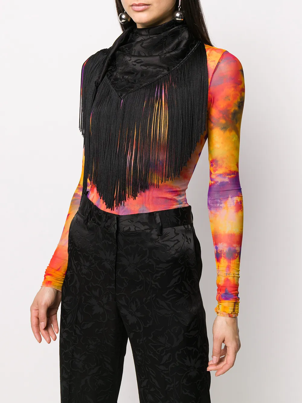 MSGM(エム・エス・ジー・エム)の、フローラル スカーフ(ブラック)。フローラル模様、ジャカード織りスタイル、フリンジ付きの裾。