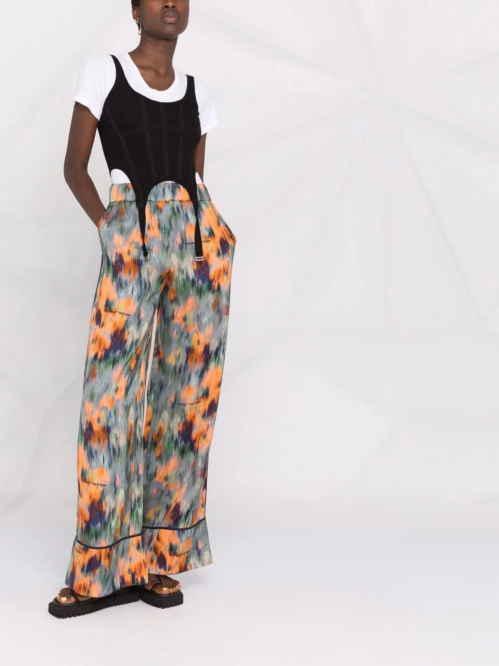 フローラルプリント、アブストラクトプリント、ハイウエスト、ゴムウエスト、サイドにロゴプリント、サイドにスリットポケット x 2、ワイドレッグ。マルチカラー。