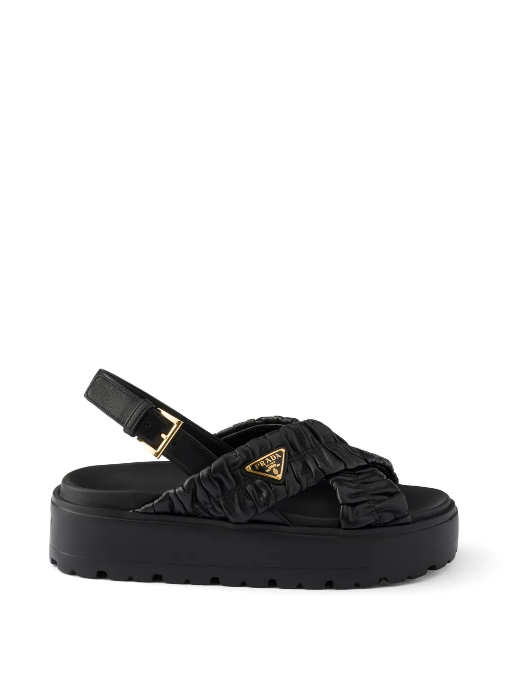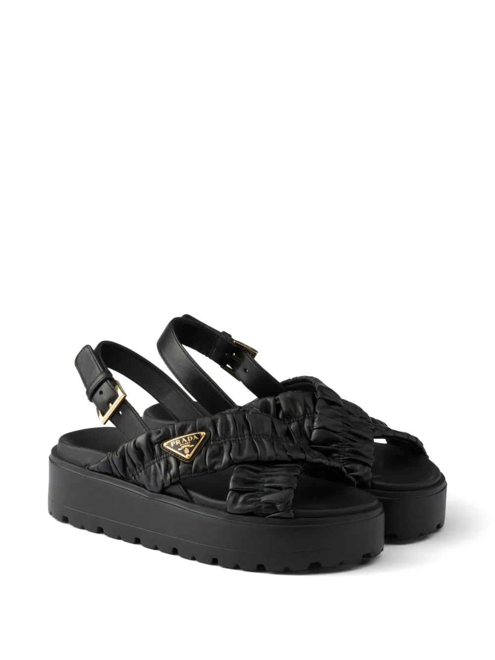 繊細なパッドによる立体的なエフェクトと、職人技が光るキルティングモチーフが、スポーティなナッパレザーサンダルの洗練されたエレガンスをより一層引き立てています。色のコントラストによって際立つメタルのトライアングルロゴが、アイコニックなアクセントとしてシルエットに独自の個性を明確に与えています。