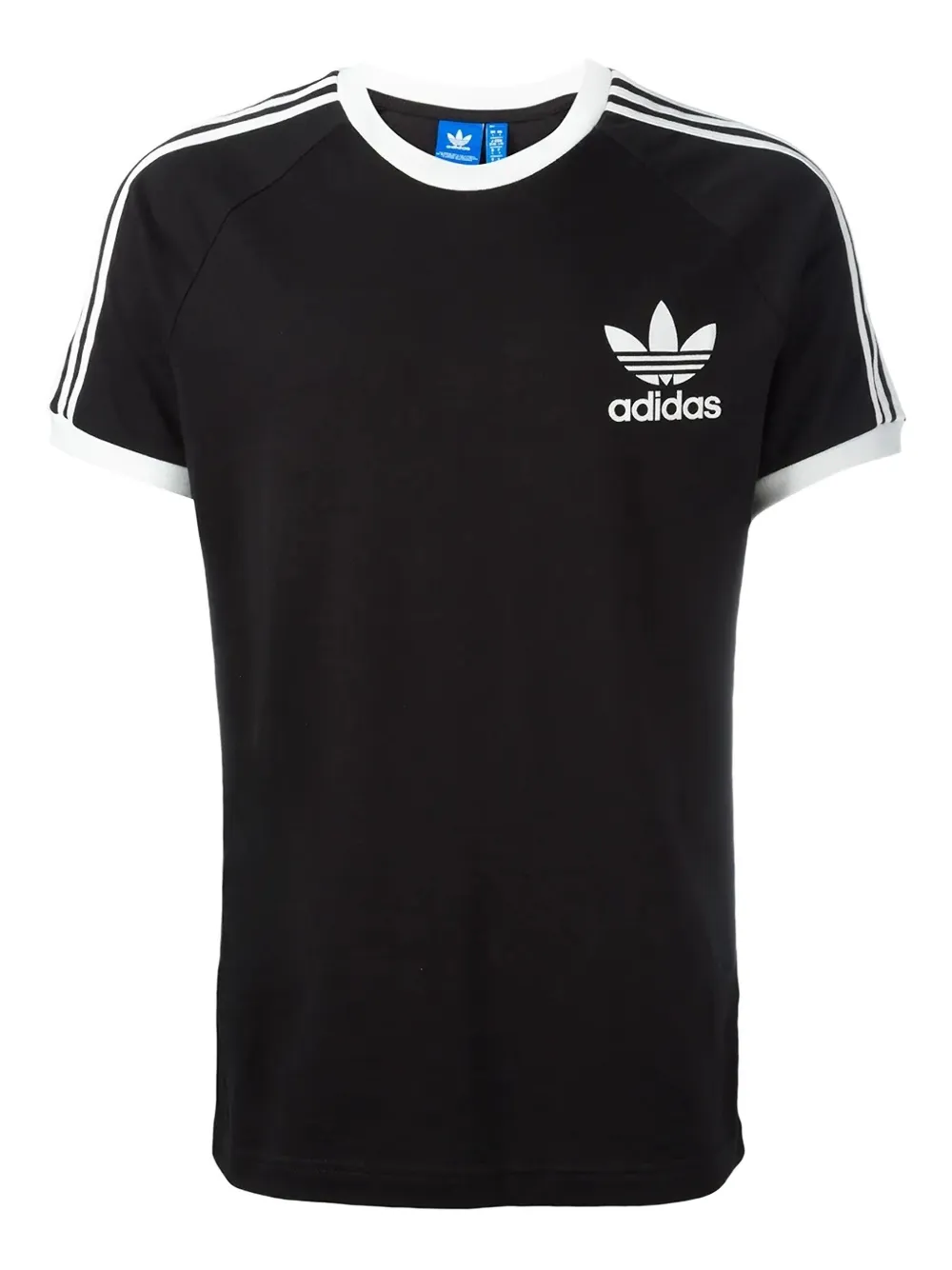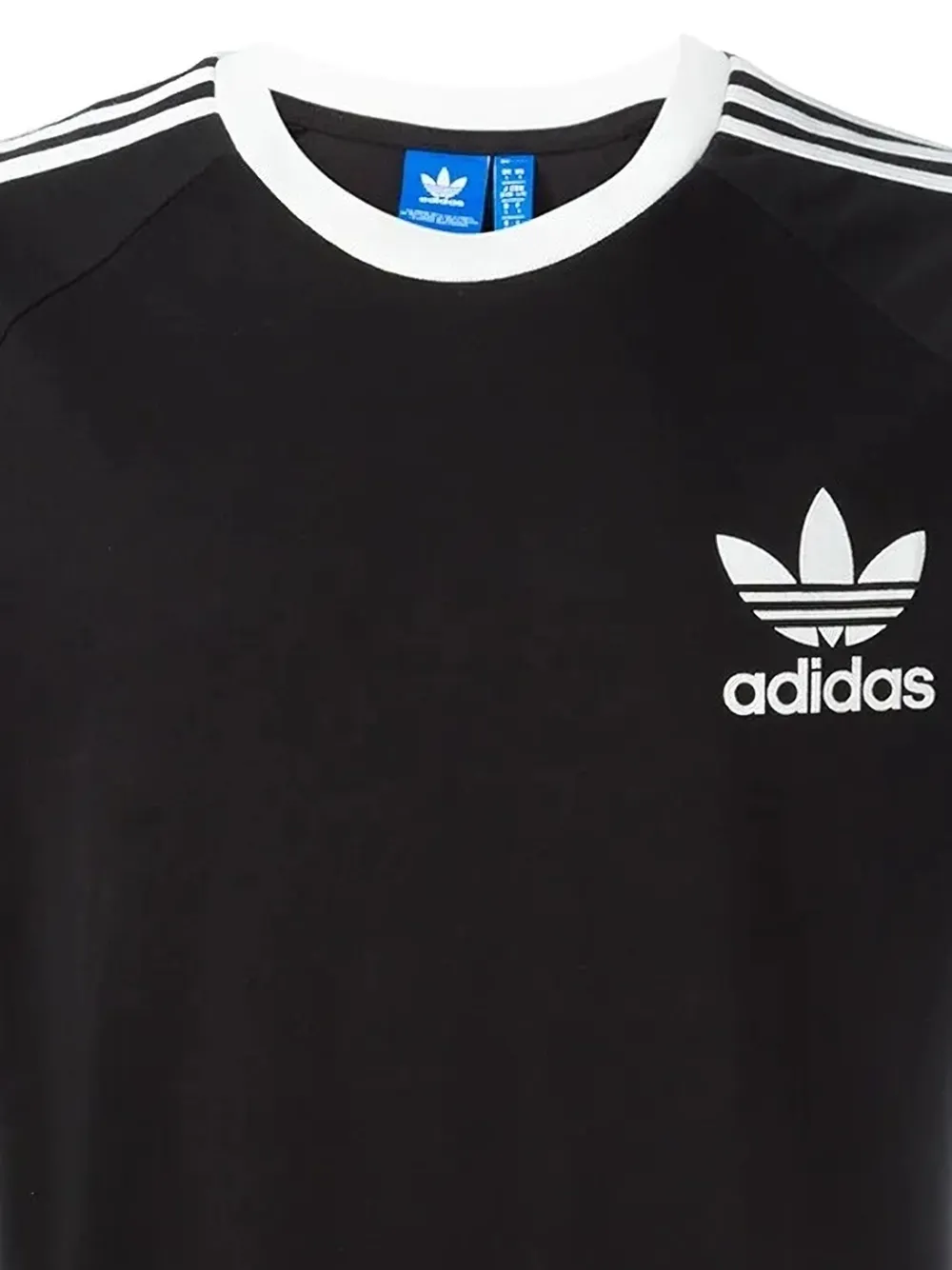 Adidas Originals의 CFLN 티셔츠. 블랙 앤 화이트 색상, 코튼 소재, 리브드 크루 넥, 앞면의 로고 프린트, 옆면 아플리케 스트라이프, 쇼트 래글런 슬리브, 스트레이트 헴 디자인.
