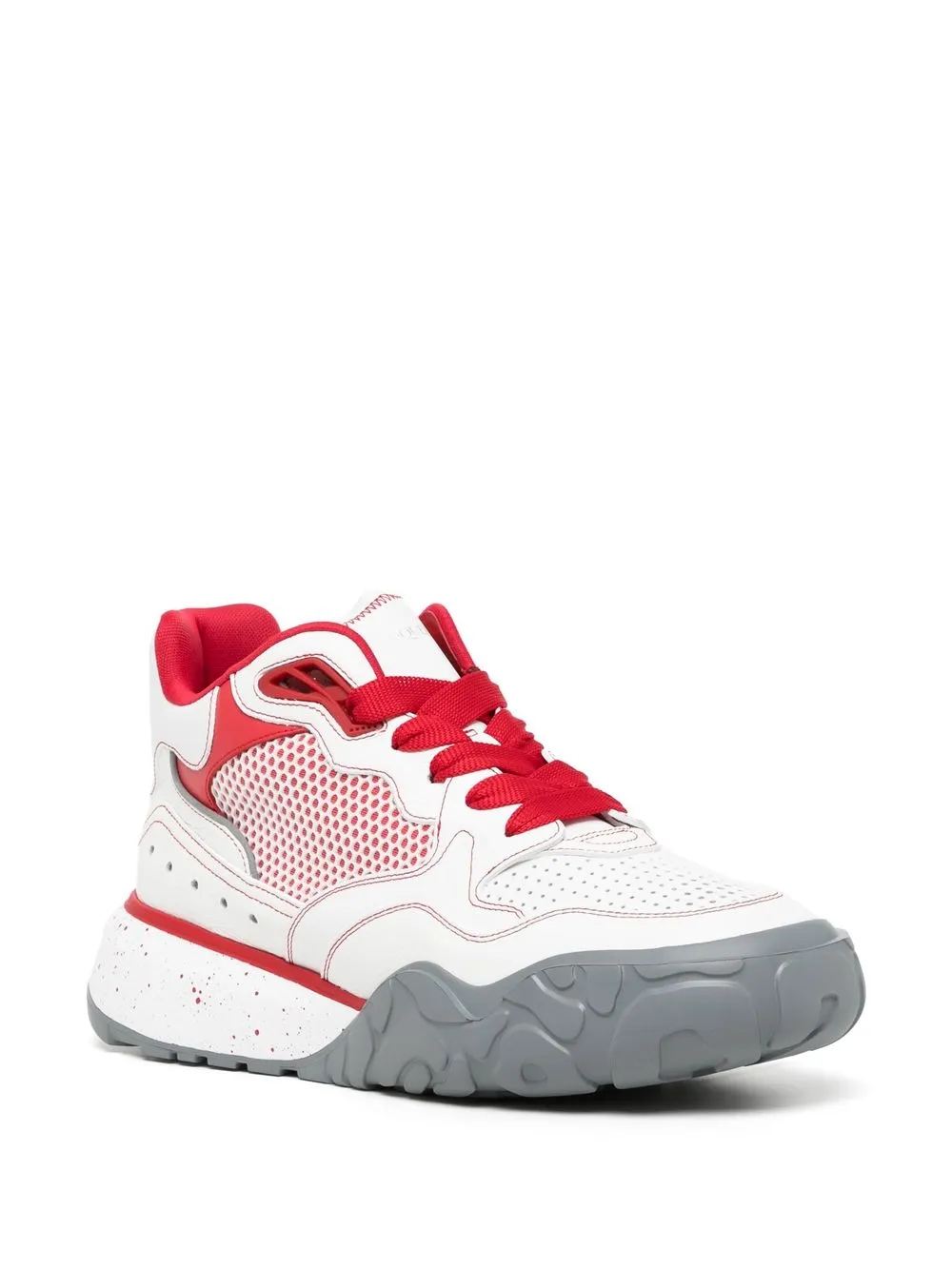 화이트, 레드, 그레이, 가죽, 메시 패널, 앞코의 퍼포레이션 디테일, 둥근 모양의 앞코, 앞면의 레이스업 스타일, 신발 혀의 로고 프린트, 브랜드 로고를 새긴 안창, 뒤축에 브랜드 로고, 두툼한 고무 밑창.