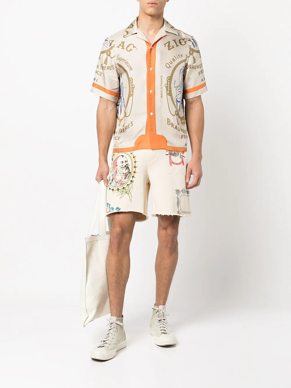 색상: 크림 화이트 코튼 소재 신축성이 좋은 저지 플리스 전체 그래픽 프린트 신축성 있는 드로스트링 허리 밴드 뒷면의 로고 패치 옆면에 있는 두 개의 포켓 뒷면의 패치 포켓 무릎 길이