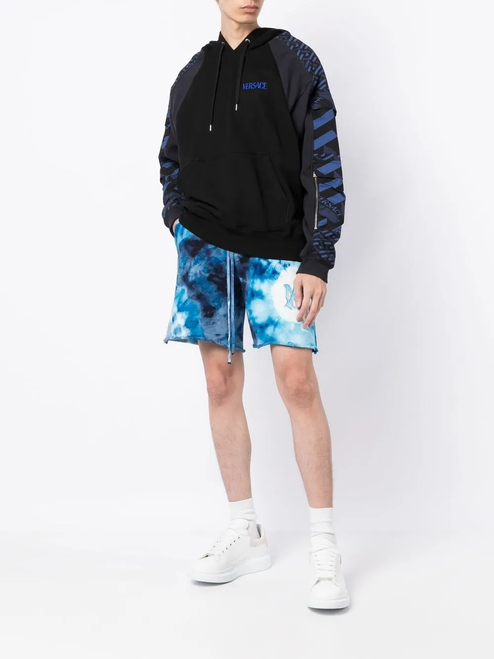블루, 화이트, 코튼, 신축성이 좋은 저지 니트, 타이다이 패턴, 뒷면의 로고 패치, 마감 처리를 하지 않은 밑단, 신축성 있는 드로스트링 허리 밴드, 옆면에 있는 두 개의 포켓, 뒷면의 패치 포켓.