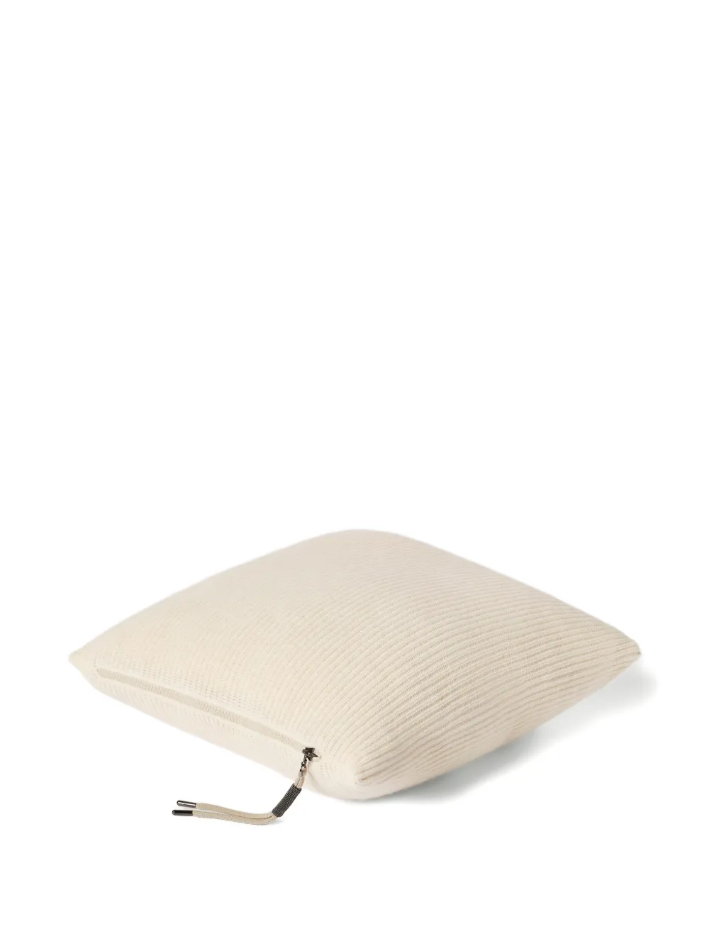 브루넬로 쿠치넬리 컬렉션의 정교한 원사가 새로운 캐시미어 잉글리시 립 니트 쿠션에 풍성함을 더해줍니다. 특수한 세미 풀 텍스처가 액세서리의 부드러운 외관을 강조하며, 지퍼 풀에 장식된 정교하고 반짝이는 모닐리 디테일이 은은한 빛을 선사합니다.