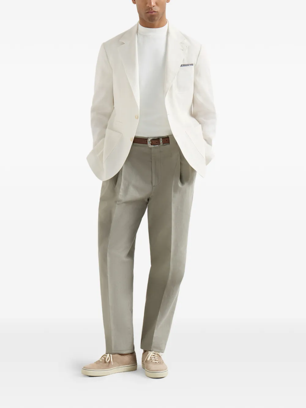 내추럴 리넨 섬유의 탁월한 품질이 패치 포켓 디테일의 언스트럭처드 블레이저에 편안한 착용감과 세련된 스타일을 선사합니다. 브루넬로 쿠치넬리 본사가 위치한 마을의 이름을 딴 '솔로메오 숄더'는 브랜드 고유의 비율을 담아 블레이저의 특징을 정의합니다. 패딩 없이도 어깨의 테이퍼드 라인과 뚜렷한 컷이 남성의 체형을 돋보이게 합니다.