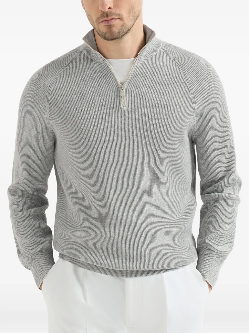 퓨어 코튼 소재의 스웨터로, 잉글리시 골지 니트 특유의 클래식하고 캐주얼한 무드에 지퍼 여밈과 래글런 소매의 스포티한 디테일을 조화롭게 매치했습니다. 가볍고 편안한 착용감을 선사하여 여름 시즌에 활용하기 이상적인 피스입니다. 실루엣은 일정한 비율을 특징으로 합니다.
