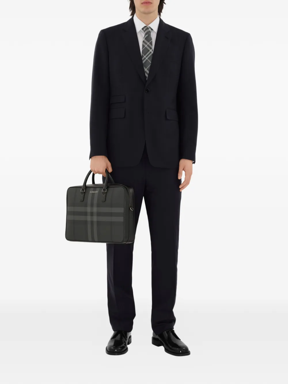 버버리 체크 패턴의 코튼 혼방 소재로 제작된 구조적인 브리프케이스로, 단색 안감으로 깔끔하게 마감되었습니다. 카프 가죽 트리밍과 탈부착 가능한 스트랩이 특징이며, 핸드백은 물론 크로스바디 백으로도 연출할 수 있습니다.