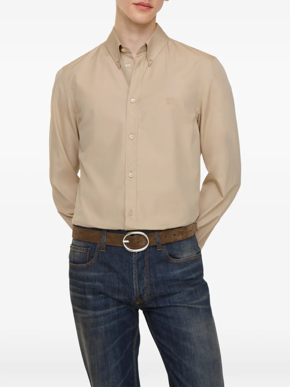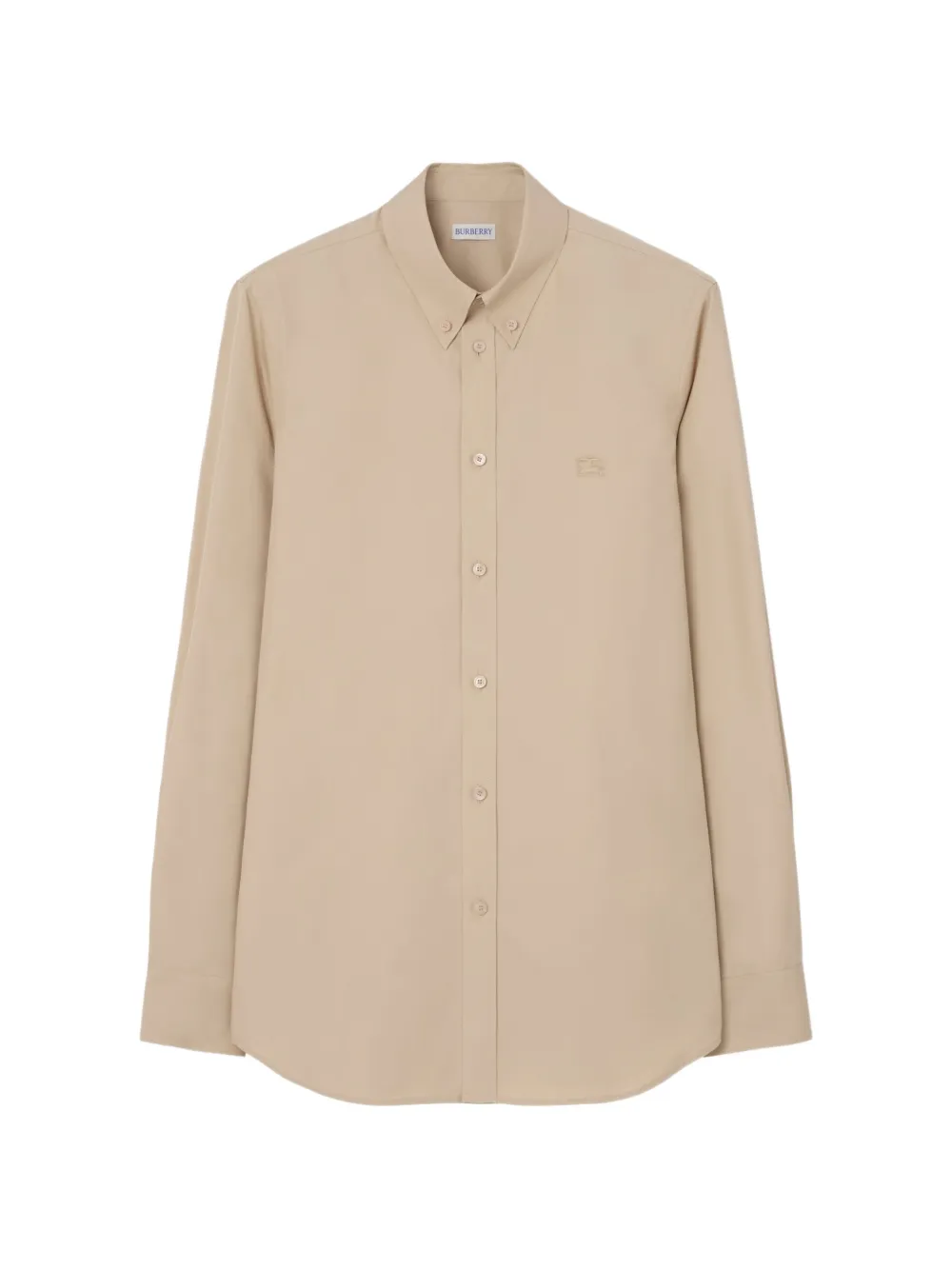 버버리 2026 여름 런웨이에서 공개된 이 셔츠는 이탈리아에서 직조된 코튼 팝린 소재를 사용하여 슬림 핏으로 정교하게 완성되었습니다. 톤온톤 컬러의 이퀘스트리안 나이트 자수와 깔끔한 버튼 다운 칼라가 특징입니다.