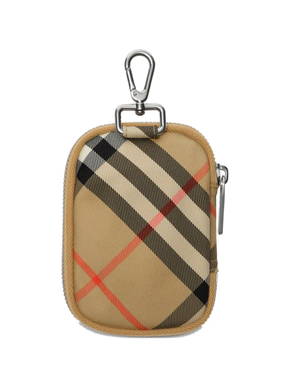시그니처 샌드 베이지 색상의 버버리 체크 소재로 제작된 컴팩트한 지퍼 지갑으로, 동일한 톤의 에퀘스트리안 나이트 디자인 아플리케가 특징입니다. 로고가 각인된 독 클립을 사용해 백팩에 연결하여 휴대할 수 있습니다.