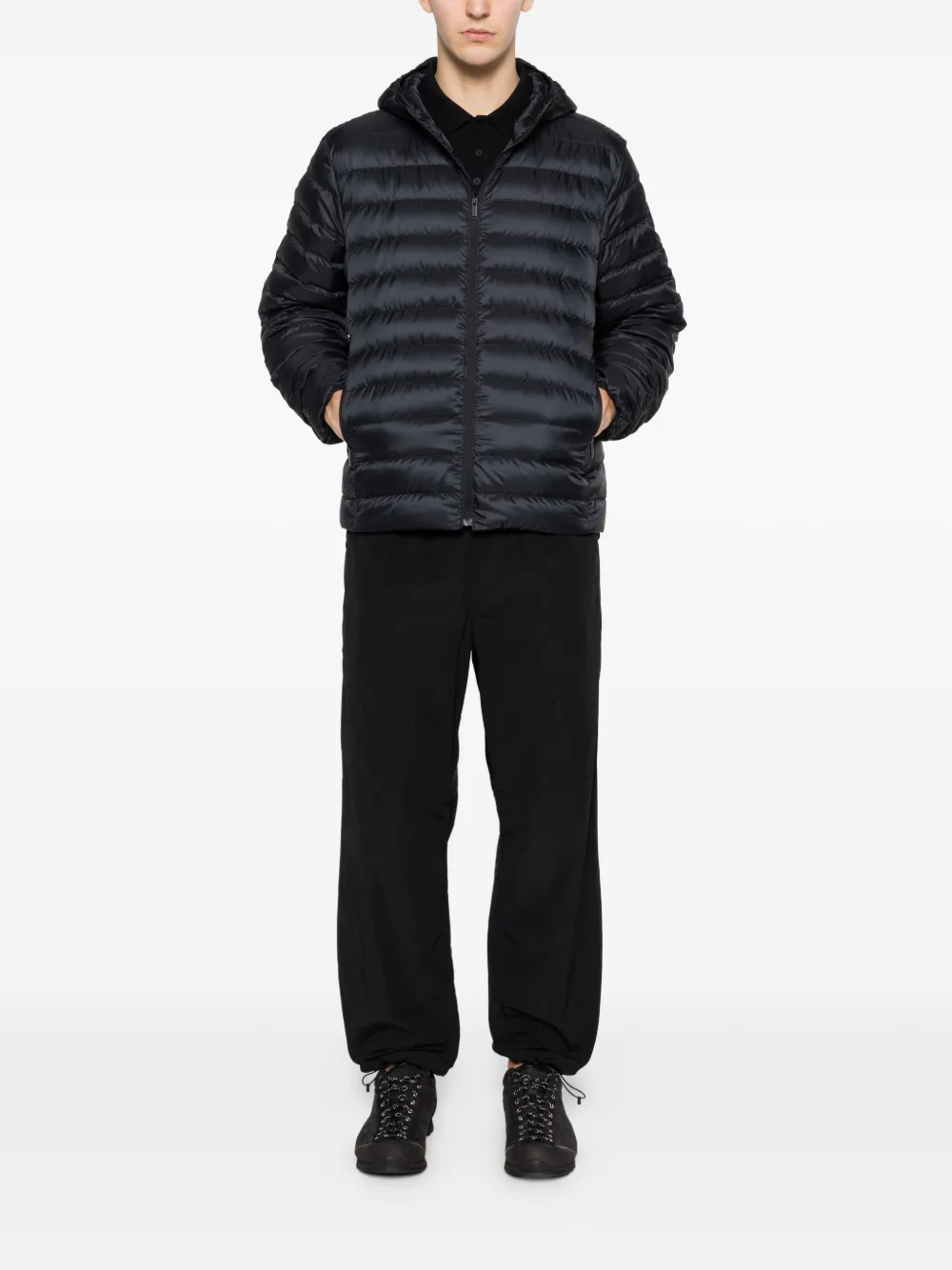 black zip fastening quilted side zip pockets hooded long sleeves