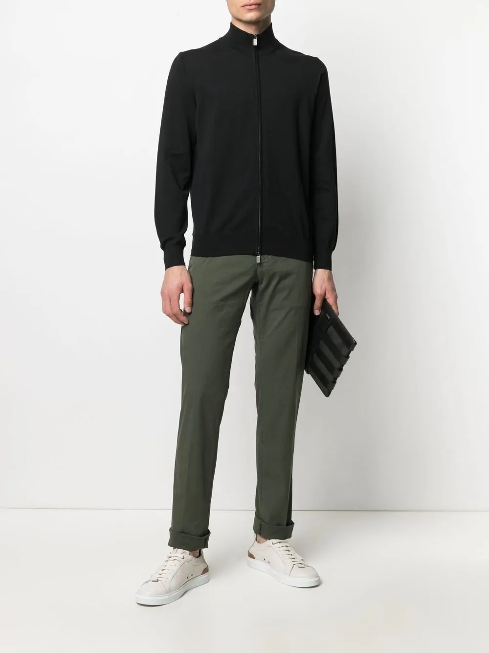 가느다란 실로 조밀하게 짠 파인 니트, 퍼넬 넥, 앞면의 지퍼로 잠그는 형식, 긴소매.