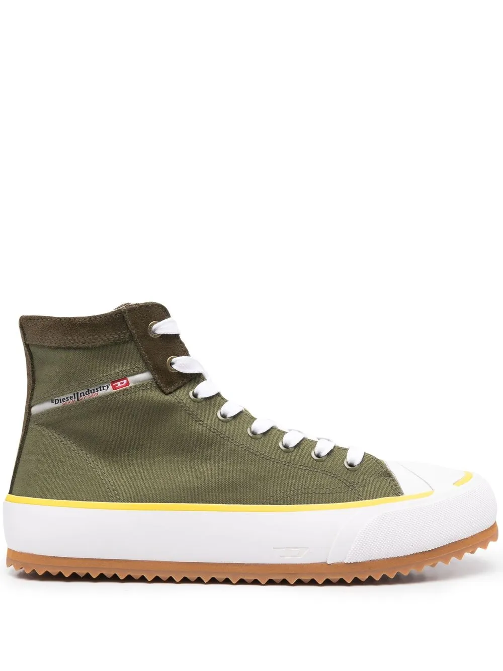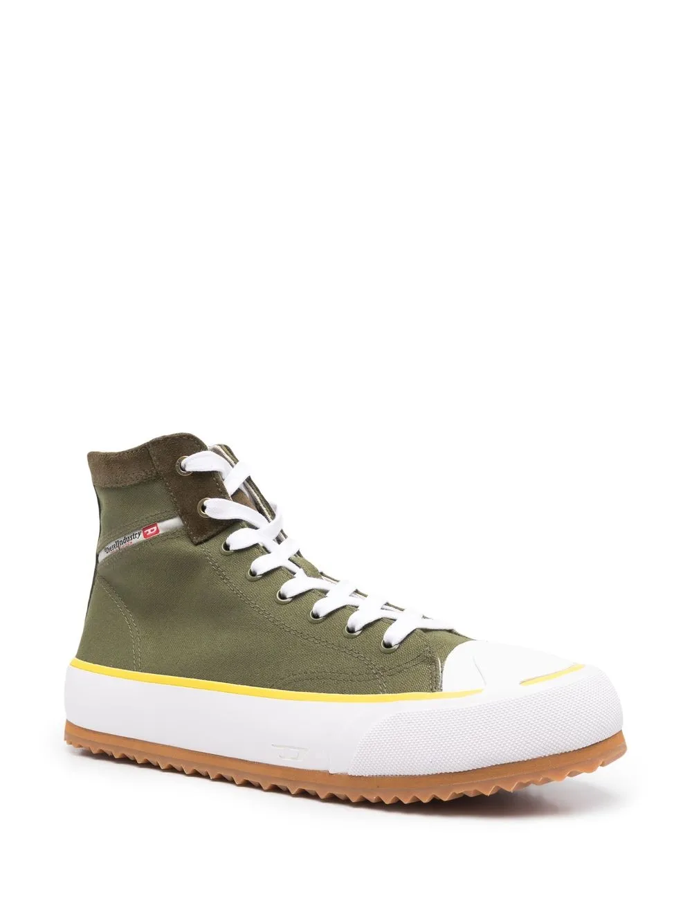 발목 길이, 옆면의 로고 프린트 디테일, 둥근 모양의 앞코, 앞면의 레이스업 스타일, 브랜드 로고를 새긴 안창, 고무 소재의 평평한 밑창.
