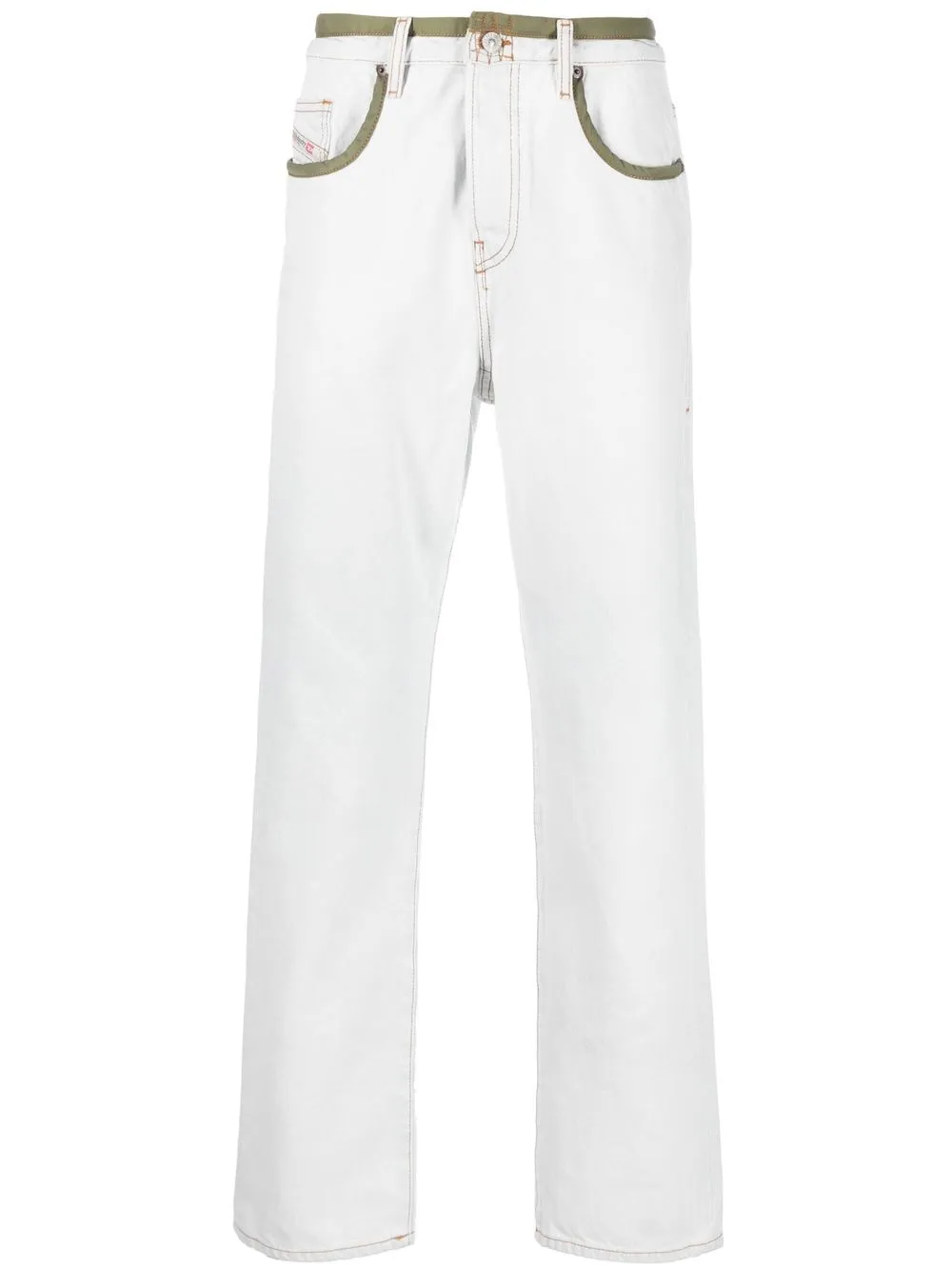 화이트, 코튼, 일자로 떨어지는 핏, 버튼으로 잠그는 형식, 벨트 고리, 클래식 5 포켓 디자인.