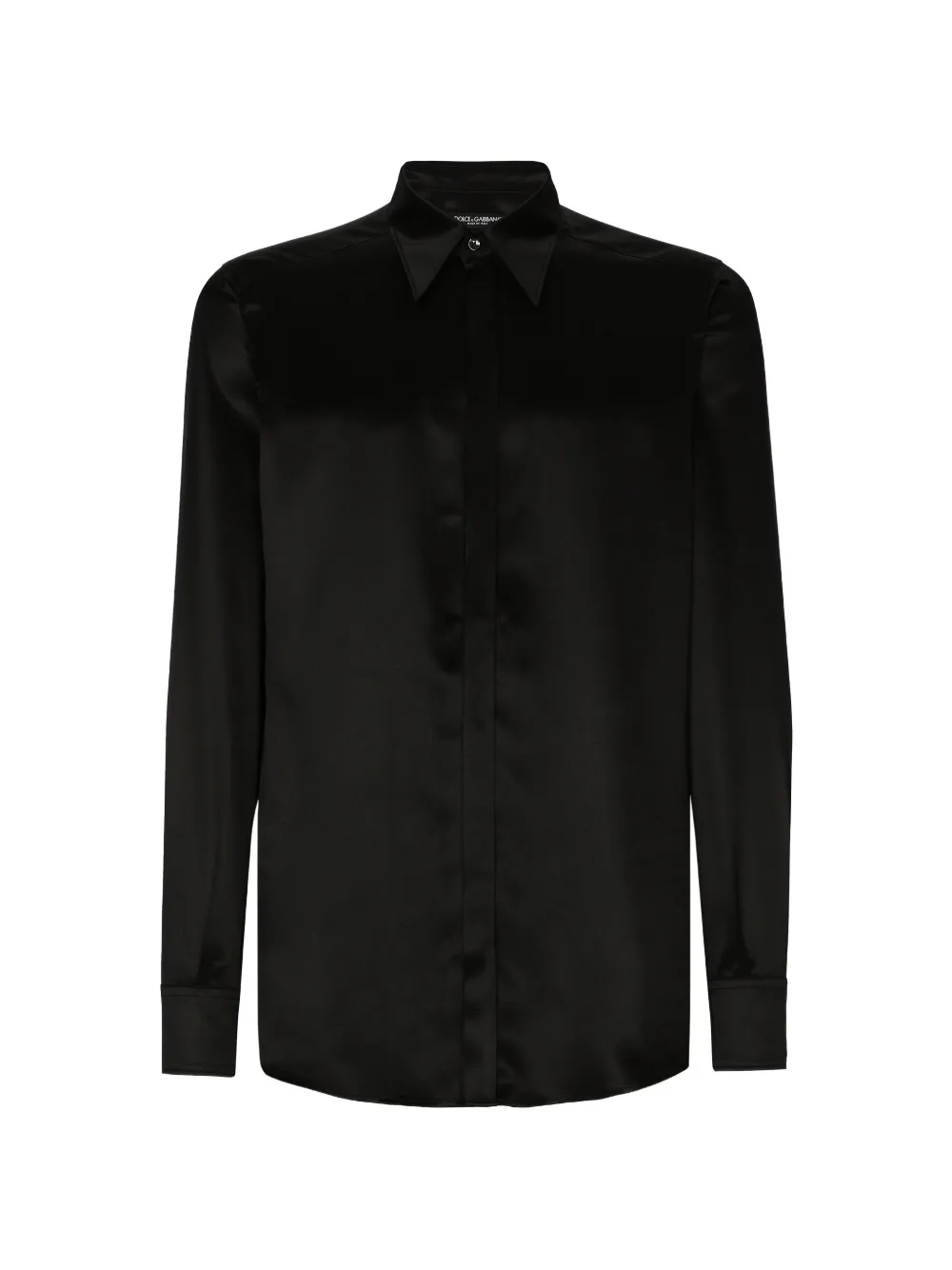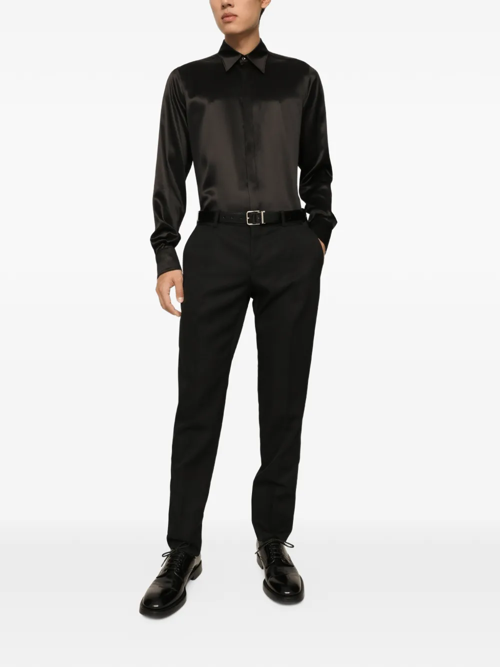 "사르토리아레" 컬렉션은 돌체앤가바나의 테일러링 전통을 보다 젊은 세대의 감각에 맞게 재해석하여 선보입니다. 새로운 시칠리아 재킷의 히든 버튼 디테일, 와이드 라펠, 그리고 새로운 비율이 제안하는 새로운 라인과 실루엣이 상징적인 테일러링을 지극히 현대적으로 재해석합니다.실크 새틴 셔츠 ^ 레귤러 마티니 핏