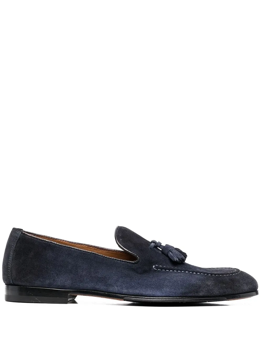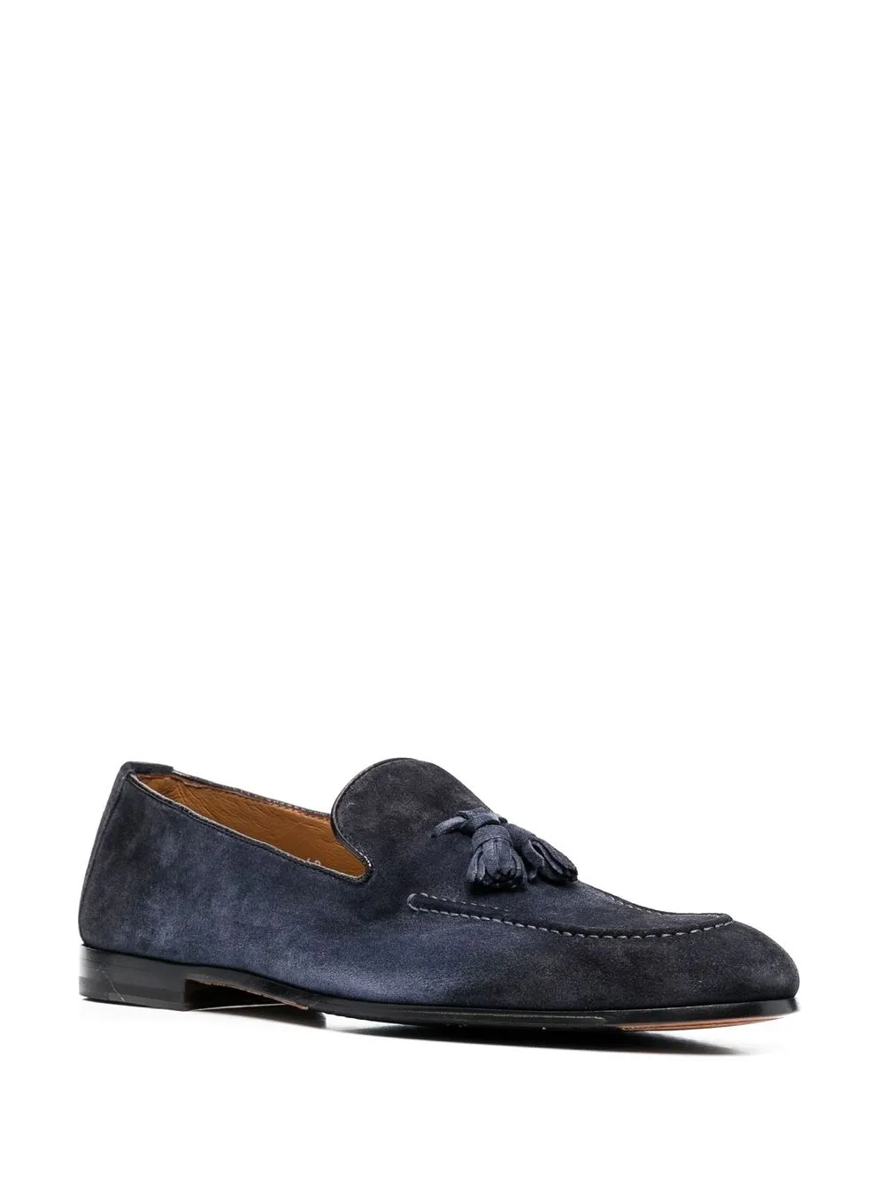 네이비 블루, 가죽, 태슬 디테일, 아몬드 모양의 앞코, 로우 힐, 브랜드 로고를 새긴 안창.