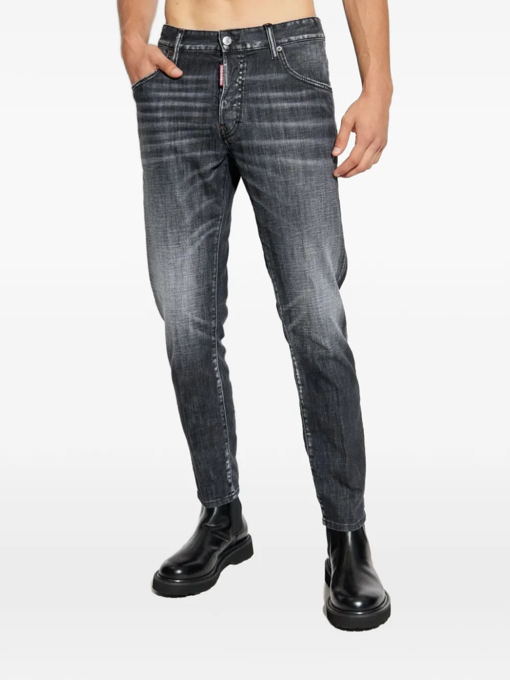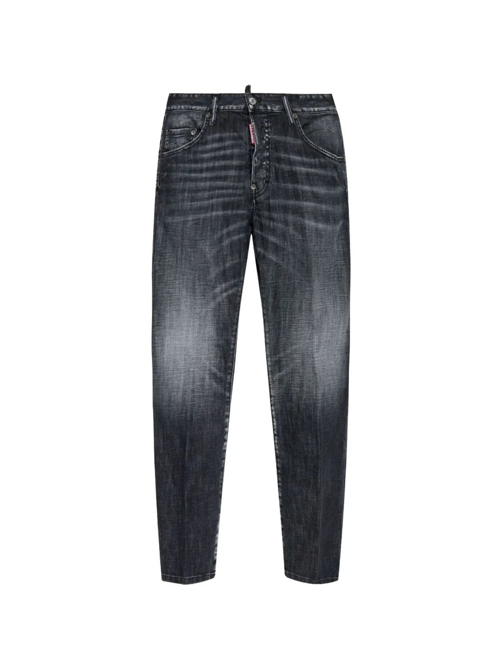 washed black logo patch belt loops five pockets button fastening tapered leg