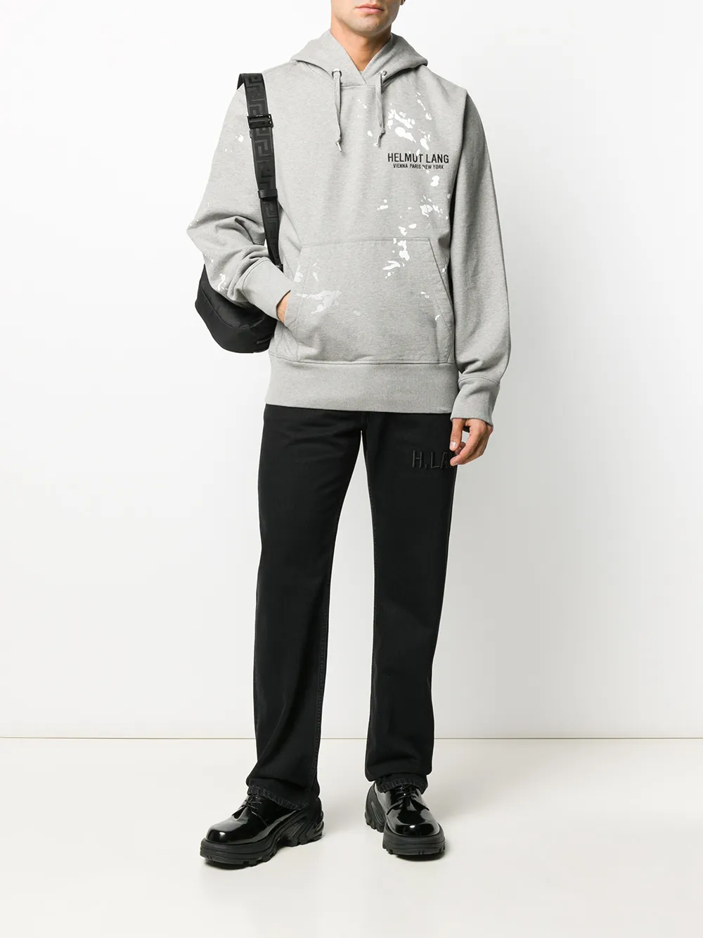 HELMUT LANG(헬무트 랭) 의 로고 드로스트링 후디. 그레이 색상, 드로스트링 후드, 긴소매, 꼭 맞는 커프스, 가슴의 로고, 캥거루 포켓.