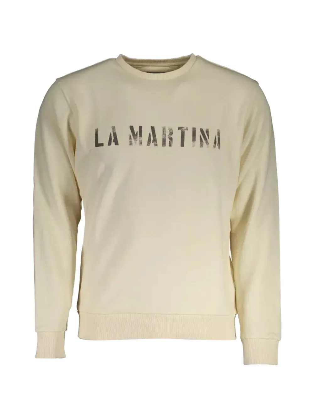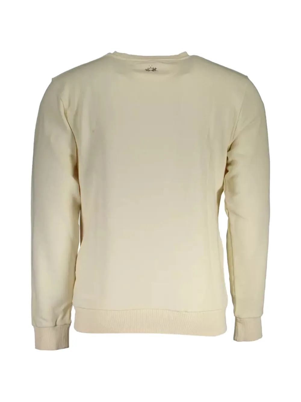 화이트 색상 코튼 앞면의 로고 프린트 크루넥 긴소매 골지 커프스 골지 밑단 뒷면의 로고 프린트