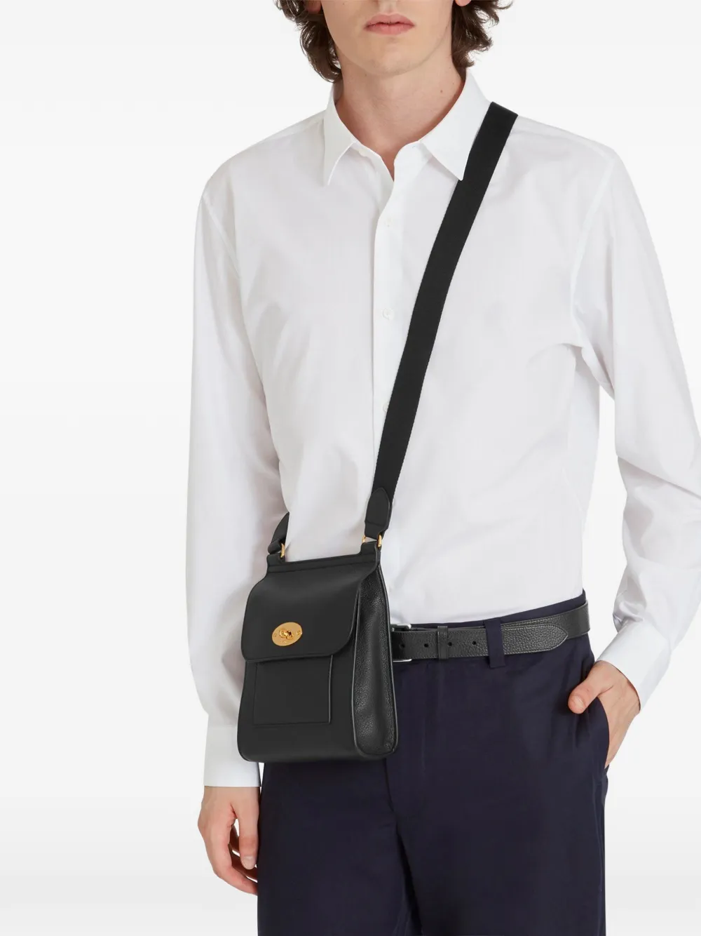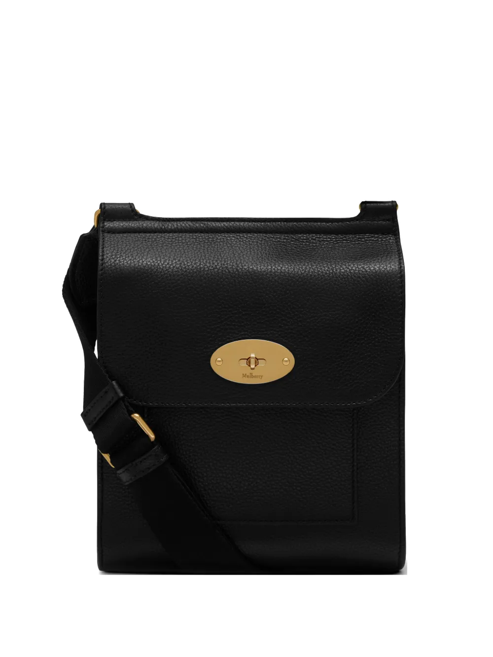 Mulberry(멀버리)의 안토니 N 클래식 그레인 숄더 백. 블랙 색상, 조절 가능한 숄더 스트랩, 폴드오버 탑, 내부의 메인 칸, 내부의 엠보스드 로고 스탬프, 앞 슬립 포켓, 골드 톤 하드웨어.