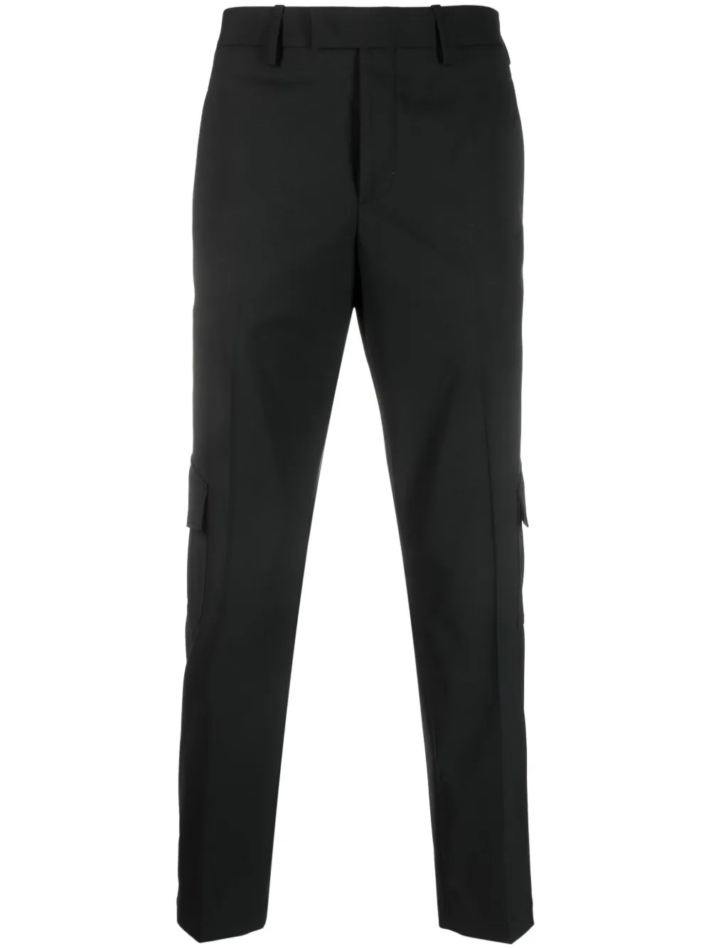 블랙, 코튼, 벨트 고리, 겉으로 드러나지 않는 앞면 잠금 형식, 옆면에 있는 두 개의 카고 포켓, 뒷면에 있는 두 개의 플랩 포켓.