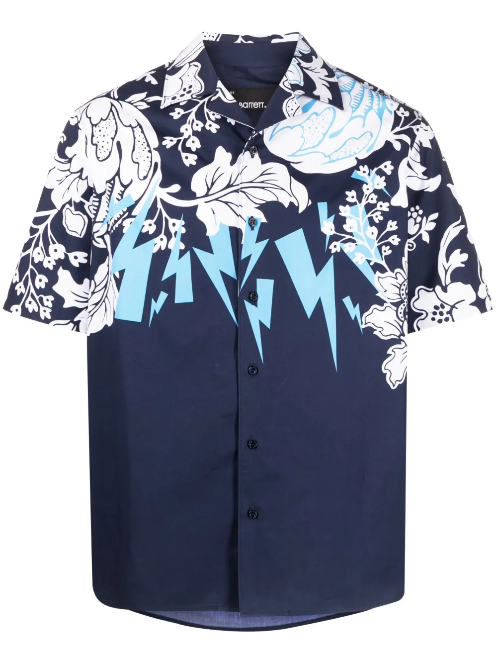 블루, 화이트, 코튼, 시그니처 번개 프린트, 플로럴 프린트, 믹스 프린트, 클래식 칼라, 앞면의 버튼으로 잠그는 형식, 반소매, 직선형의 밑단.