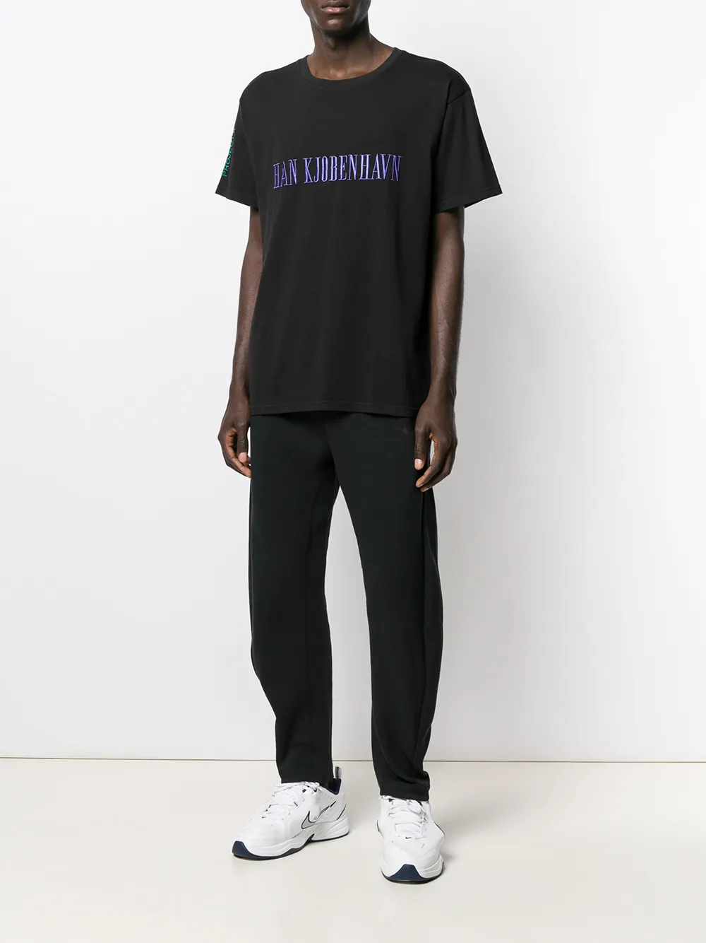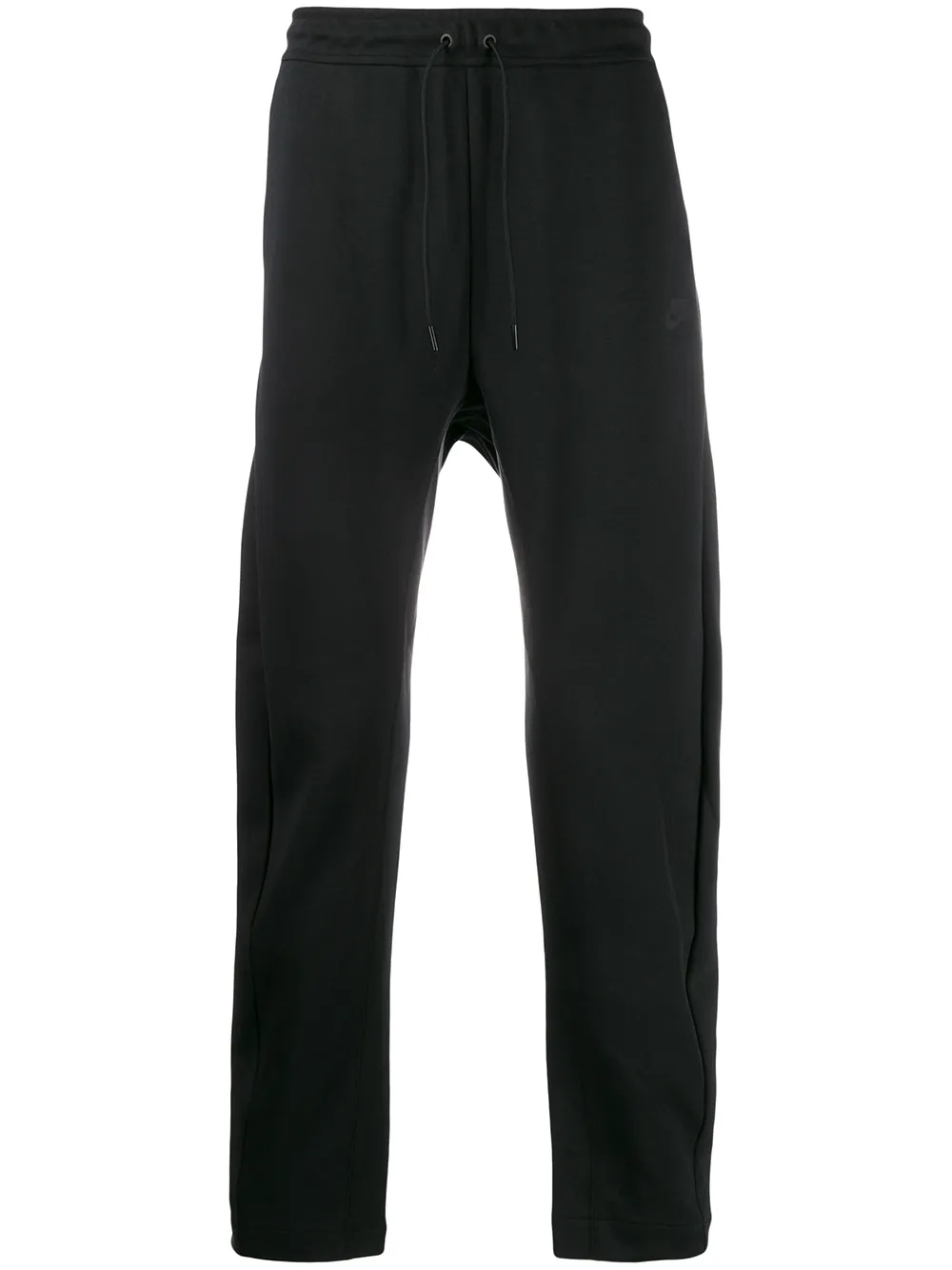 NIKE(나이키)의 배기 핏 트랙팬츠. 블랙 색상, 허리 부분에 드로스트링이 들어간 신축성 있는 디자인, 옆 포켓, 표준 길이.