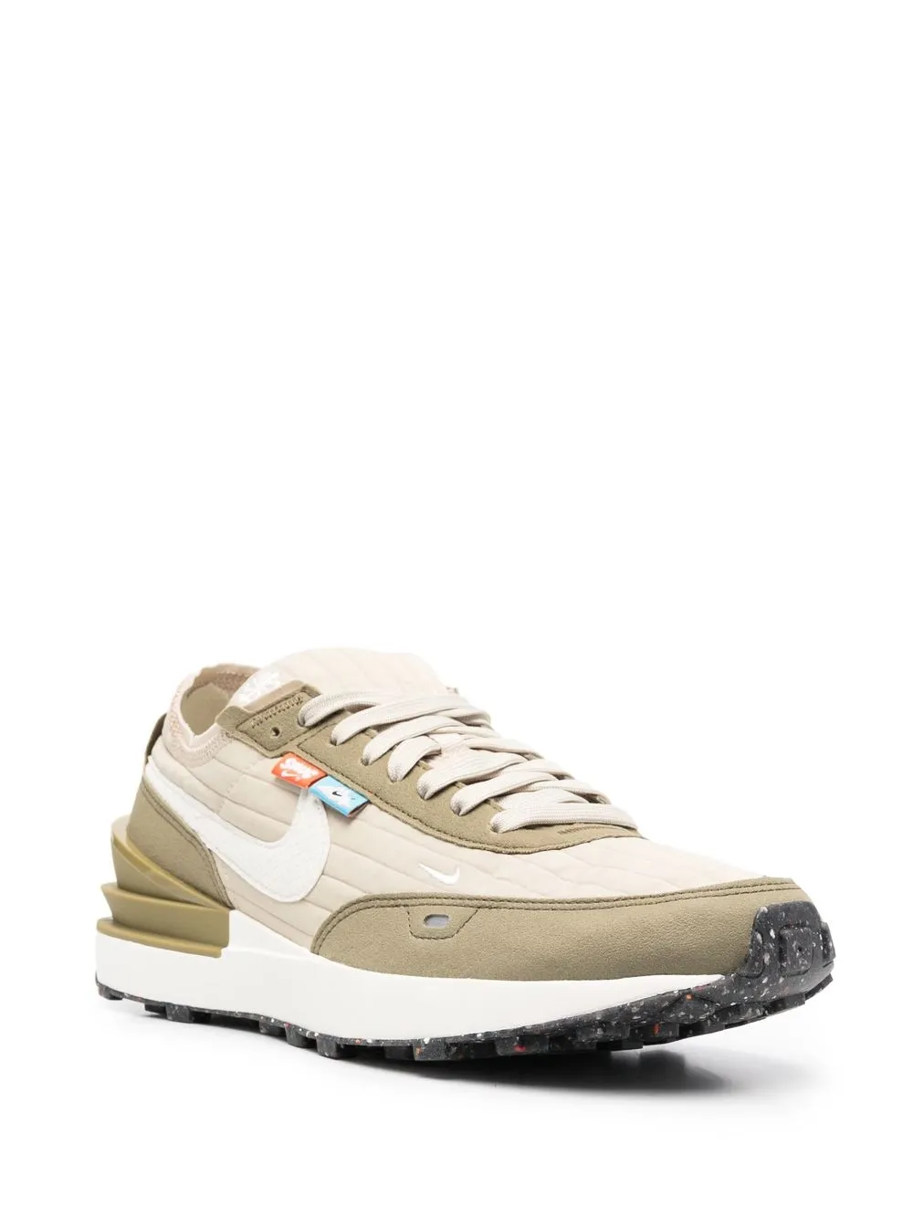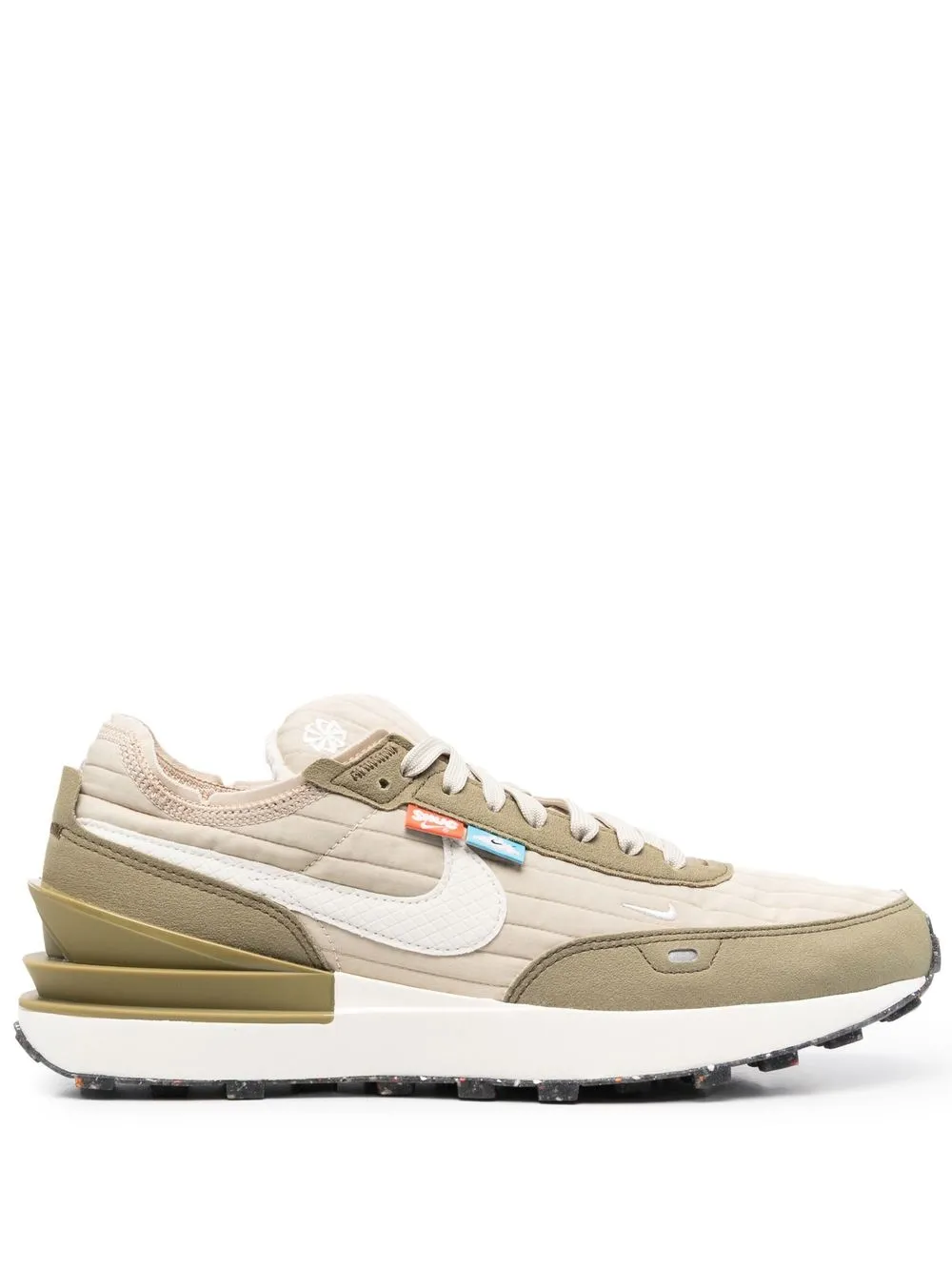 베이지, 모스 그린, 가죽, 패널 디자인, 시그니처 스우시 로고 디테일, 퀼팅 패널, 미니 로고 태그, 앞면의 레이스업 스타일, 둥근 모양의 앞코, 브랜드 로고를 새긴 풋베드, 고무 소재의 평평한 밑창.