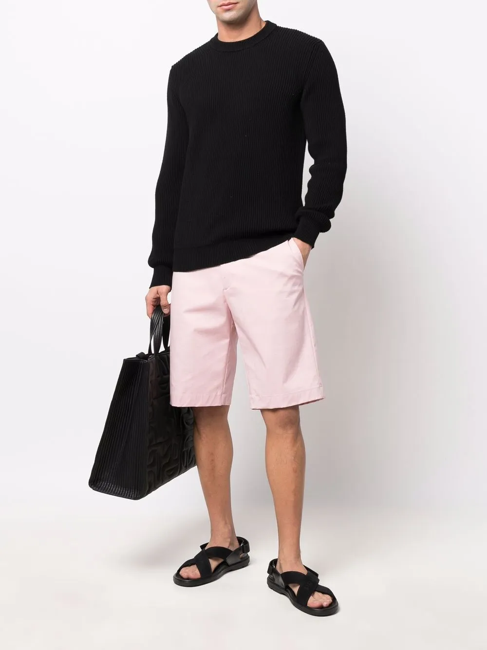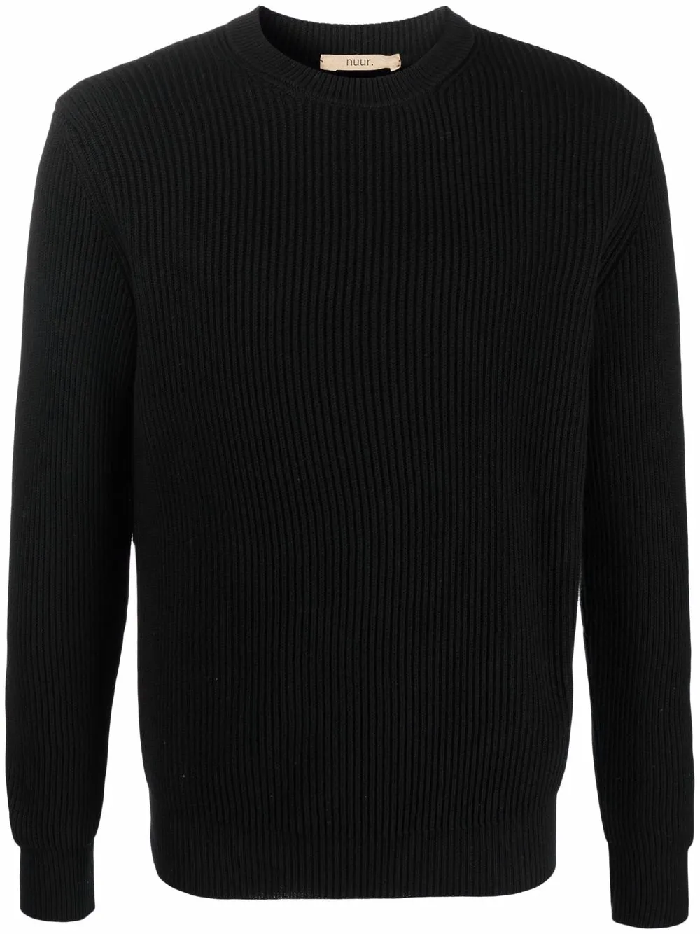 색상: 블랙. 골지 조직 디테일, 라운드 넥, 긴소매, 직선형의 밑단.