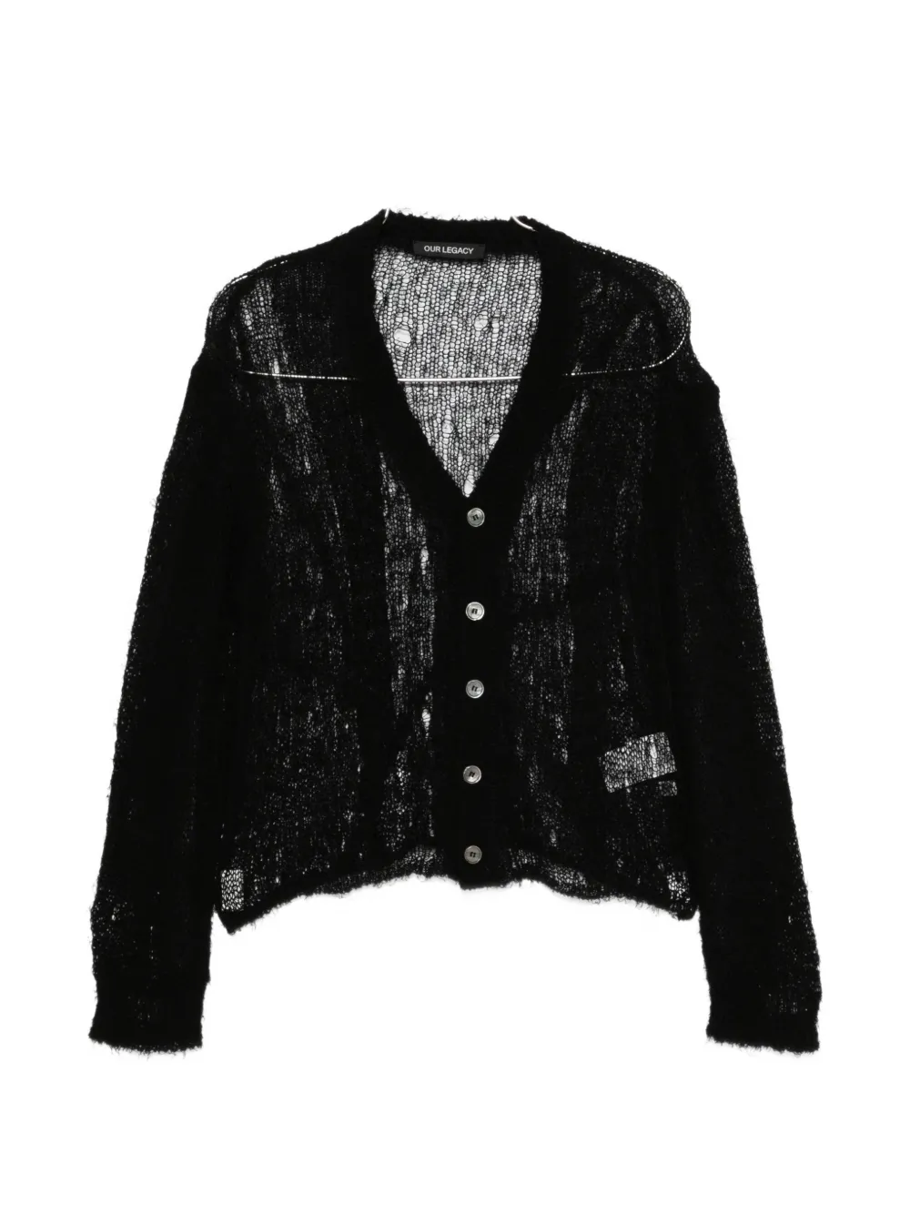 black open-knit construction V-neck front button fastening long sleeves straight hem