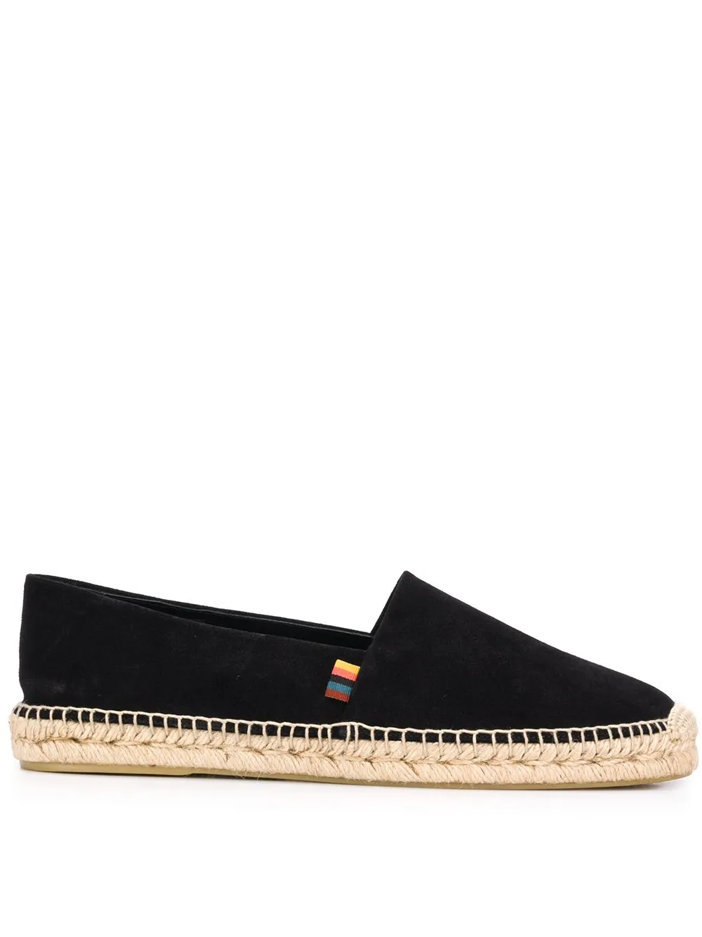 PAUL SMITH(폴 스미스)의 슬립온 에스파드리유. 블랙 색상, 둥근 모양의 앞코, 브랜드 로고를 새긴 안창, 플랫 힐.