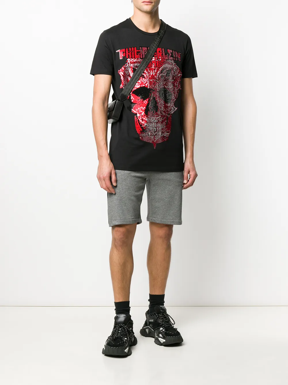 PHILIPP PLEIN(필립 플레인)의 스컬 장식 반소매 티셔츠. 라운드 넥, 반소매, 앞 중앙에 위치한 로고 스탬프.