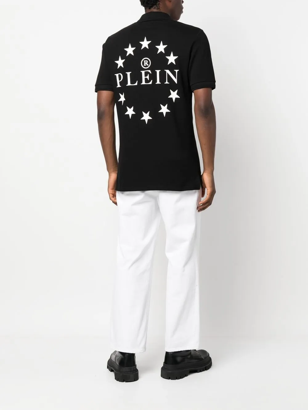블랙, 코튼, 폴로 칼라, 반소매, 가슴의 로고 패치, 뒷면의 로고 프린트, 직선형의 밑단.