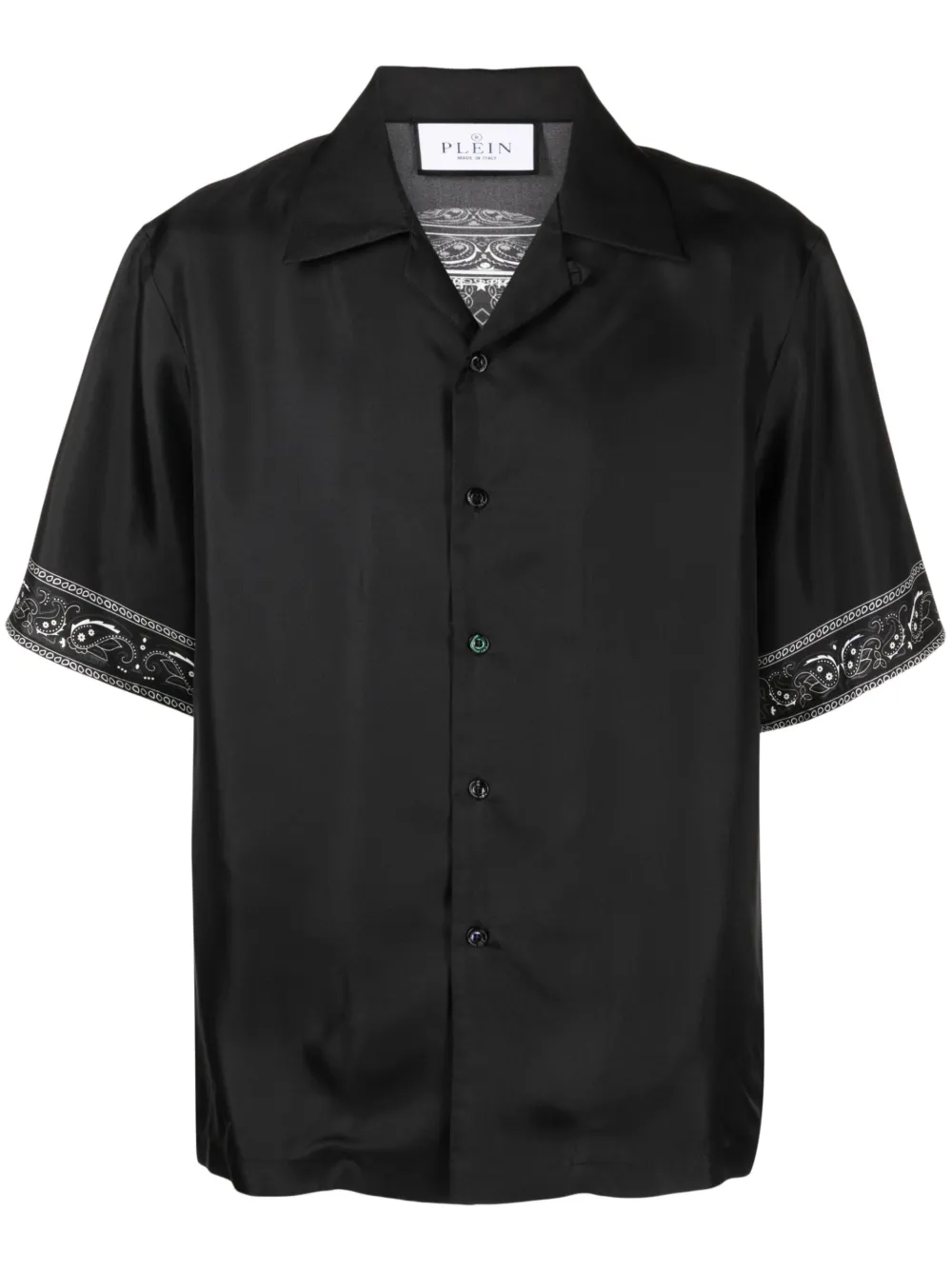 블랙, 화이트, 실크, 반다나 프린트, 페이즐리 프린트 밴드, 뒷면의 스컬 프린트, 뒷면의 로고 프린트, 스프레드 칼라, 앞면의 버튼으로 잠그는 형식, 반소매, 직선형의 밑단.