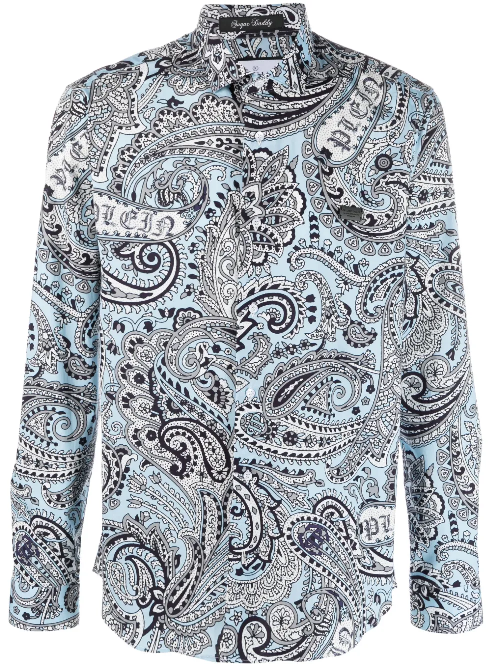 라이트 블루, 멀티컬러, 스트레치 코튼, 전체 로고 프린트, 페이즐리 프린트, 클래식 칼라, 앞면의 버튼으로 잠그는 형식, 긴소매, 둥근 밑단.