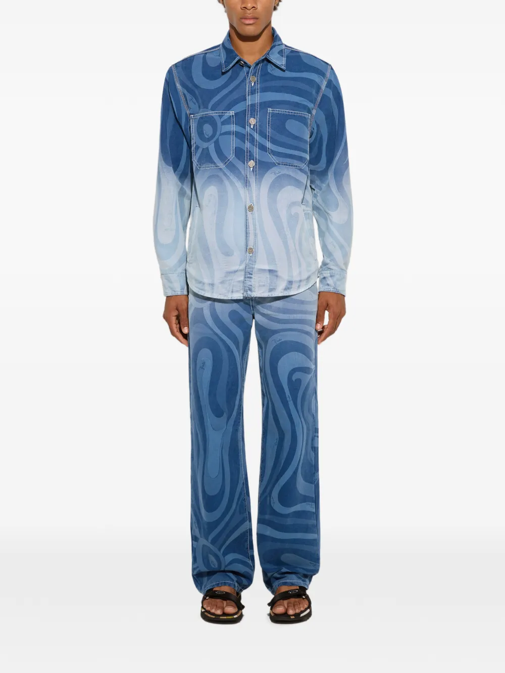 데님을 현대적인 감각으로 재해석한 대담한 디자인의 재킷입니다. 오버사이즈 컷이 여유롭고 모던한 실루엣을 선사하며, 코튼 소재의 탄탄한 구조감이 균형을 잡아줍니다. 라이트 블루 색상의 마르모 프린트가 은은한 그라데이션 효과와 함께 어우러져, 컬러와 표면 사이의 유연한 조화를 보여줍니다. 버튼 클로저와 체스트 포켓으로 실용적인 터치를 더했으며, 강렬한 시각적 효과를 주는 룩을 완성하기 위한 핵심 피스입니다.