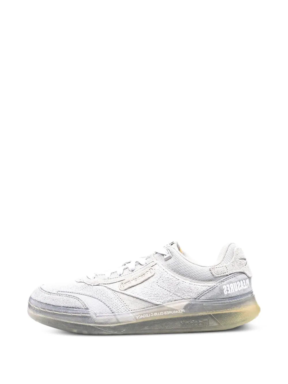 색상: 그레이. 컬러 블록 패널 디자인, 옆면의 로고 패치, 뒤축에 브랜드 로고, 앞면의 레이스업 스타일, 둥근 모양의 앞코, 퍼포레이션 디테일, 갈아끼울 수 있는 신발 끈, 브랜드 로고를 새긴 안창.
