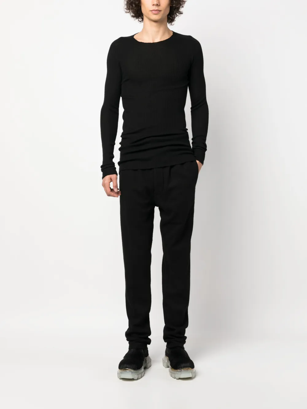 블랙, 캐시미어, 니트 디자인, 조밀한 골지 조직, 크루 넥, 긴소매, 직선형의 밑단.